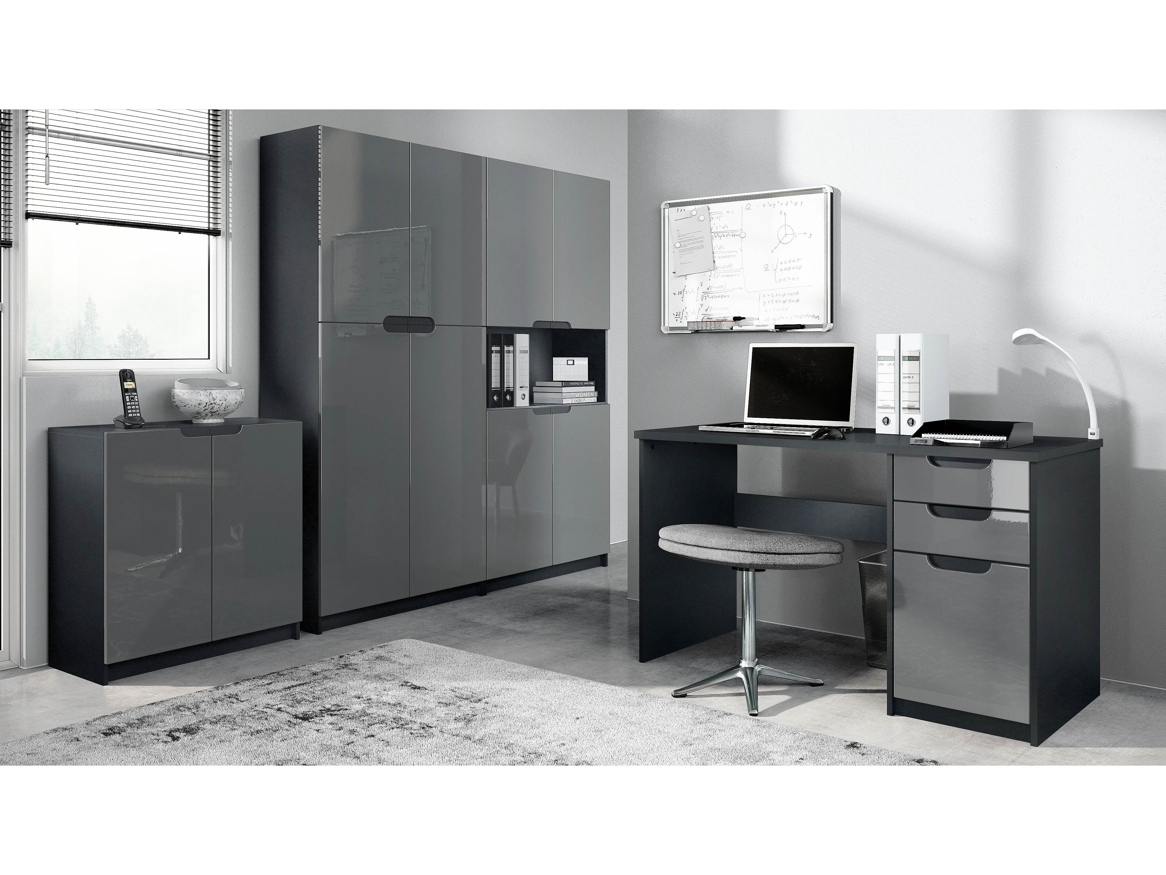 Ensemble de meubles de bureau Armoire Commode Rangement Logan, Corps en noir mat / Façades en gris haute brillance