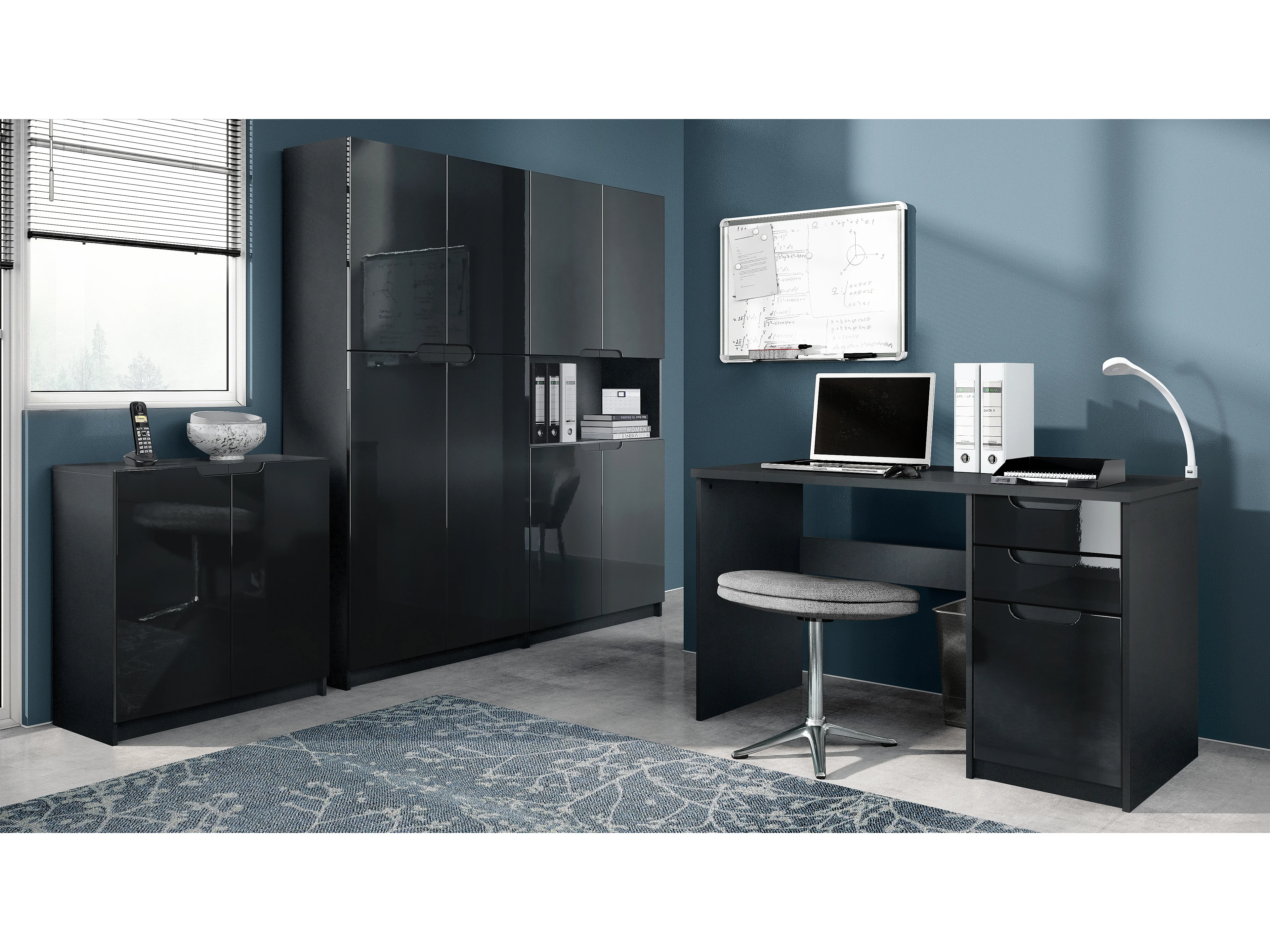 Ensemble de meubles de bureau Armoire Commode Rangement Logan, Corps en noir mat / Façades en noir haute brillance