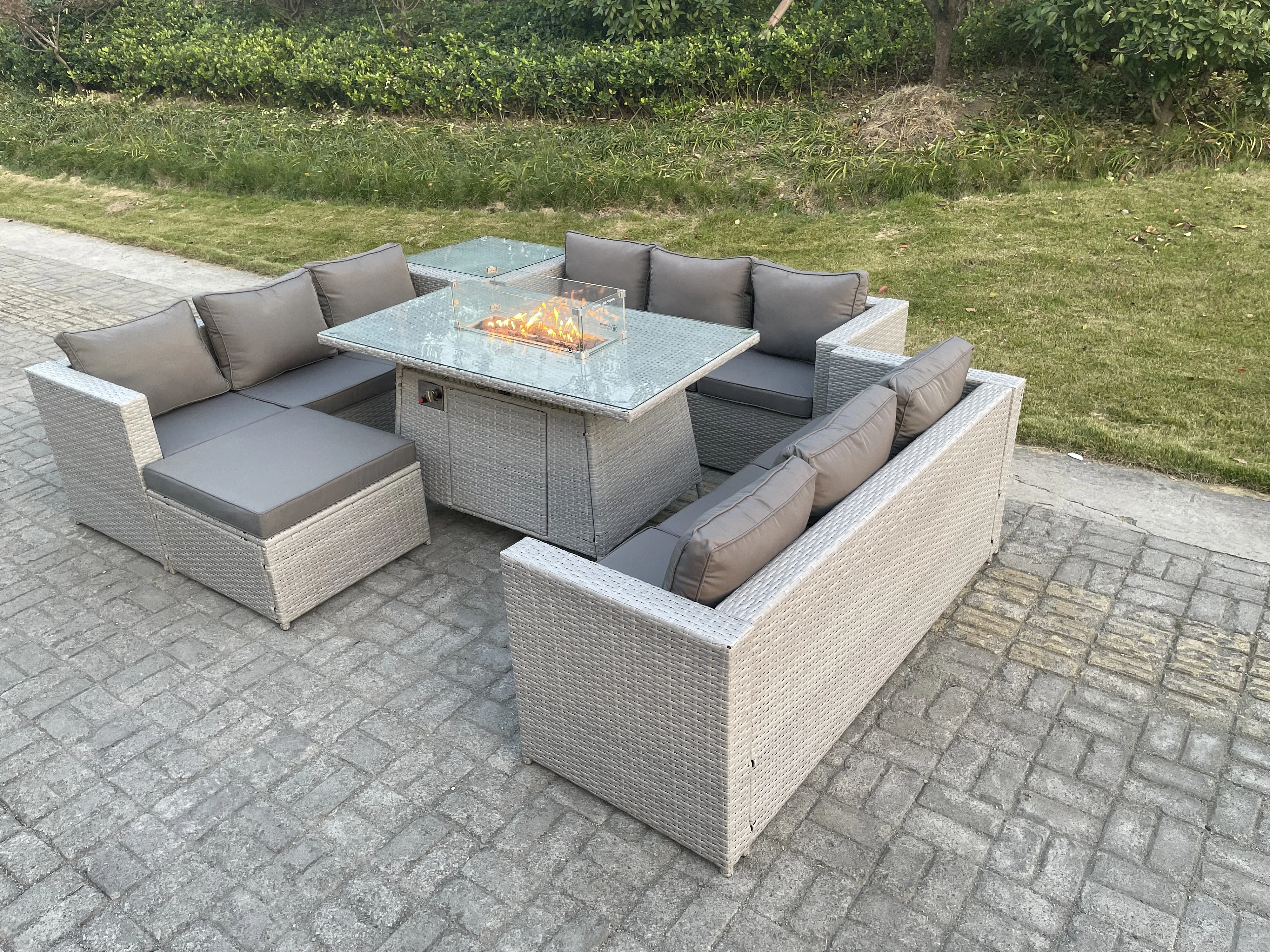 Ensemble de meubles de jardin en rotin ensemble Table de foyer à gaz canapé ave Table d'appoint Grand Tabourets Gris Clair