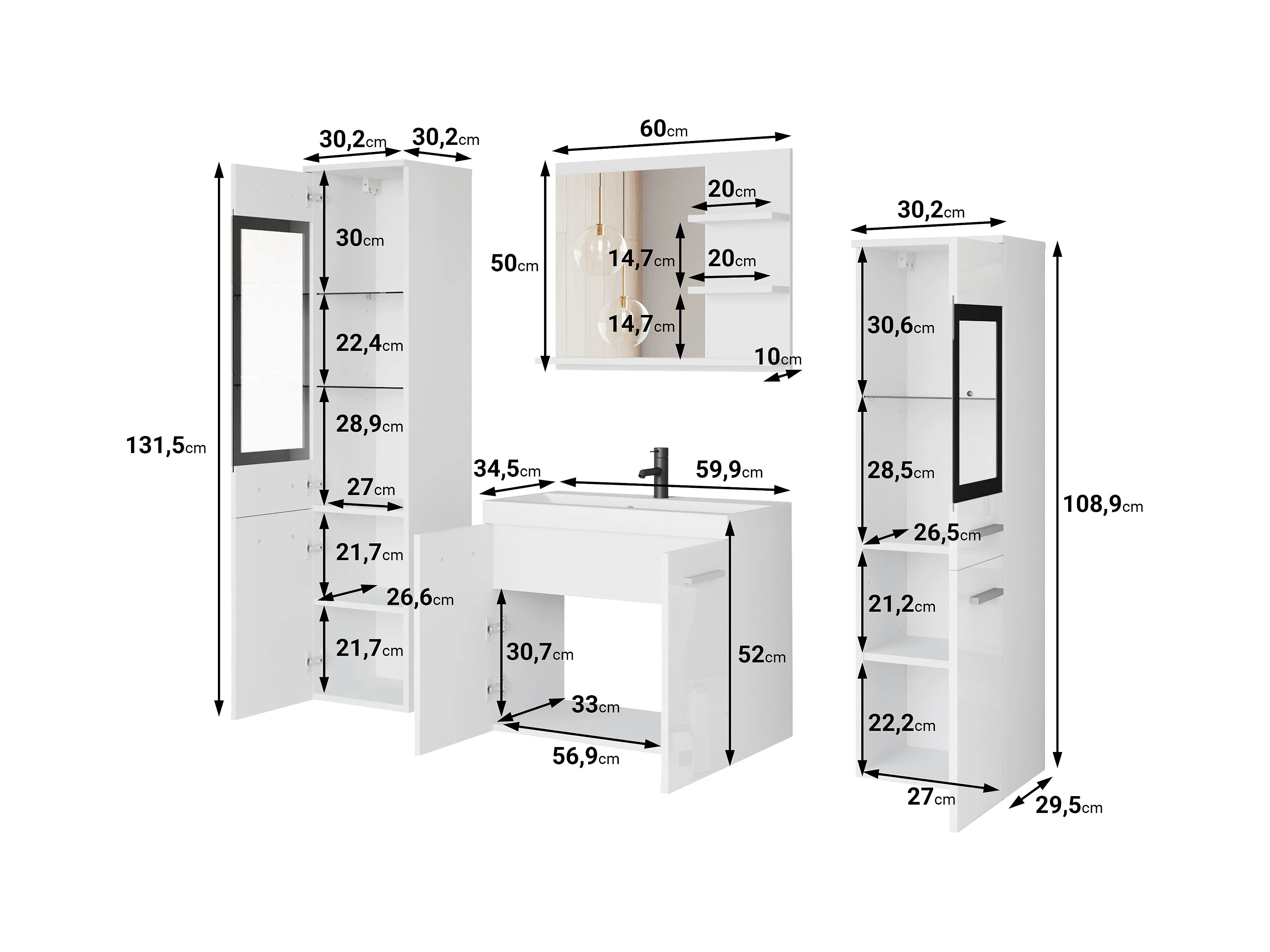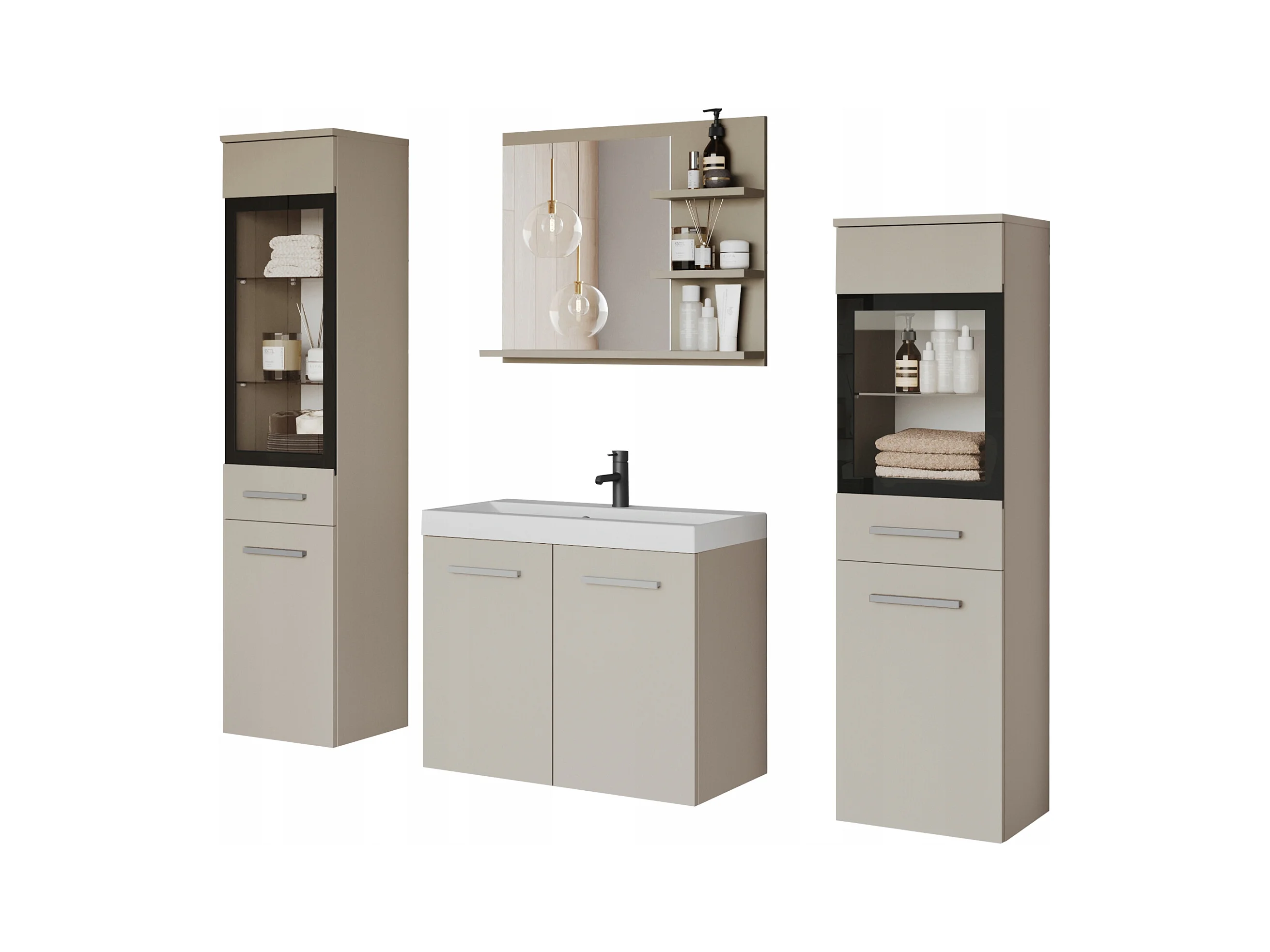 Ensemble de salle de bain, meubles suspendus avec lavabo, 2 colonnes et miroir avec étagères, beige cachemire mat