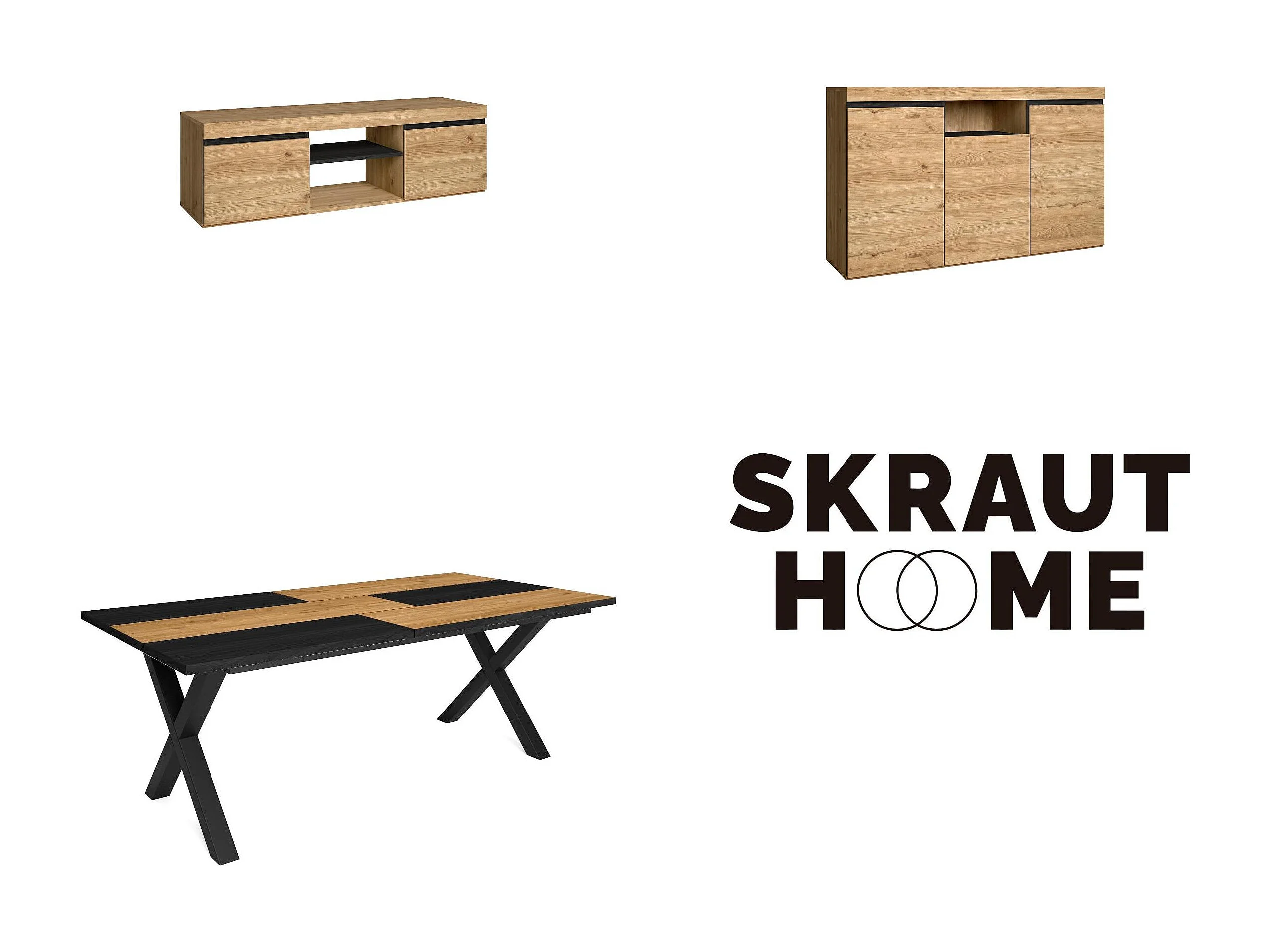 Ensemble de meubles de salon, Table 200 Bicolore pieds X 10 convives, Meuble TV 140, Crédence / Buffet 140, Chêne, Noir, Industriel