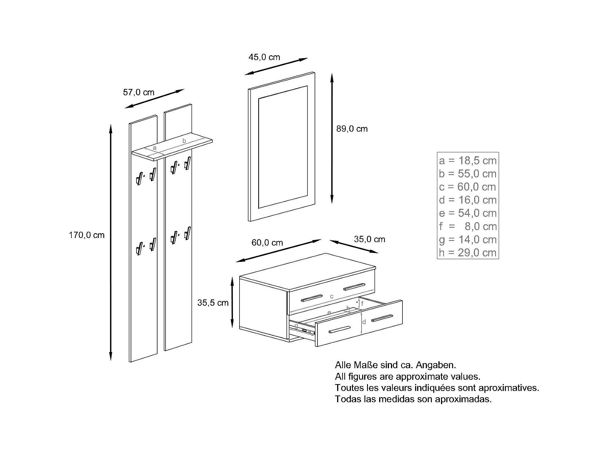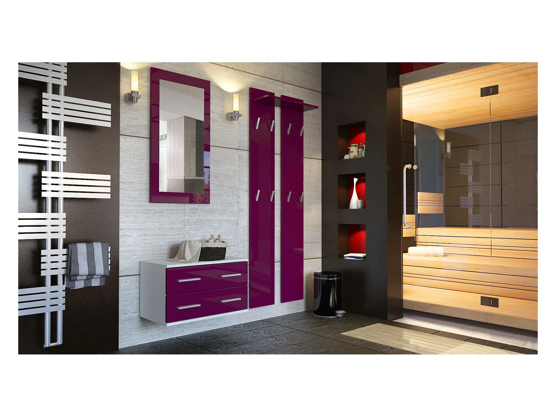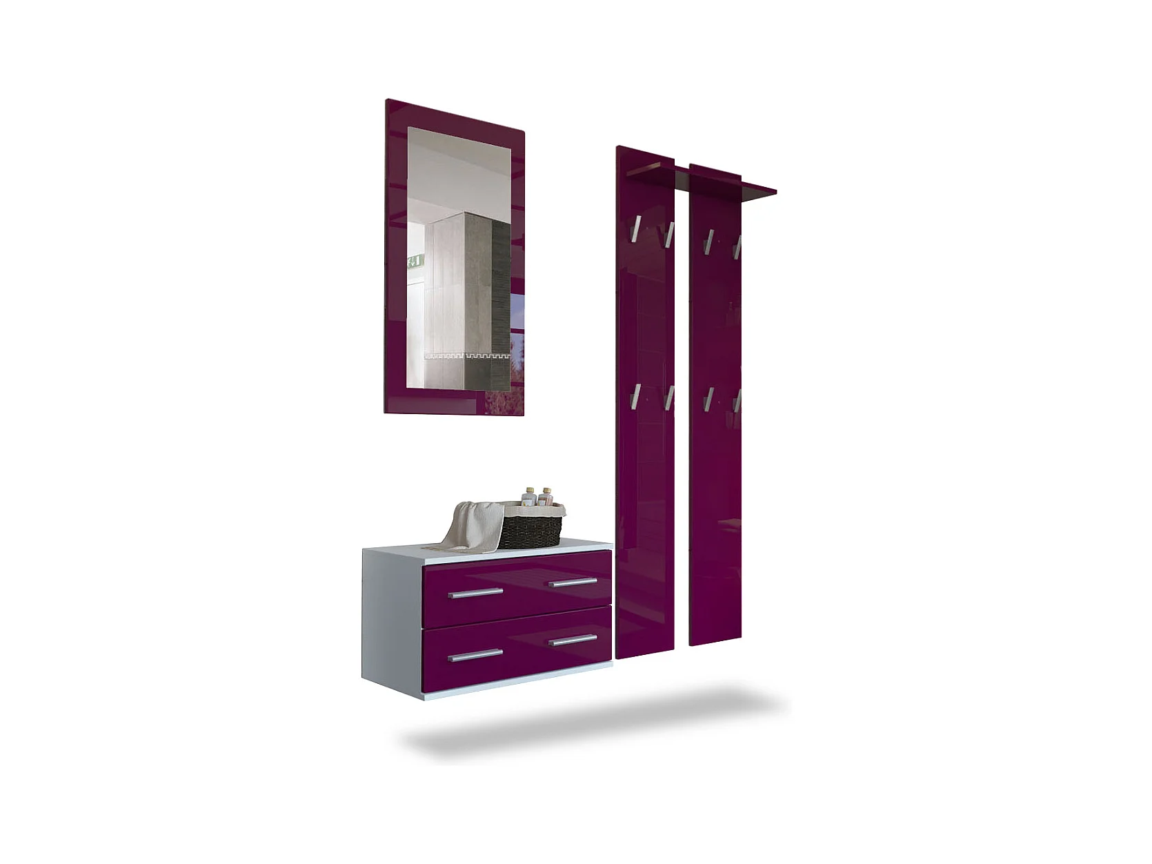 Ensemble de meubles d'entrée Kioto, Corps en Blanc mat / Façades en Mûre haute brillance