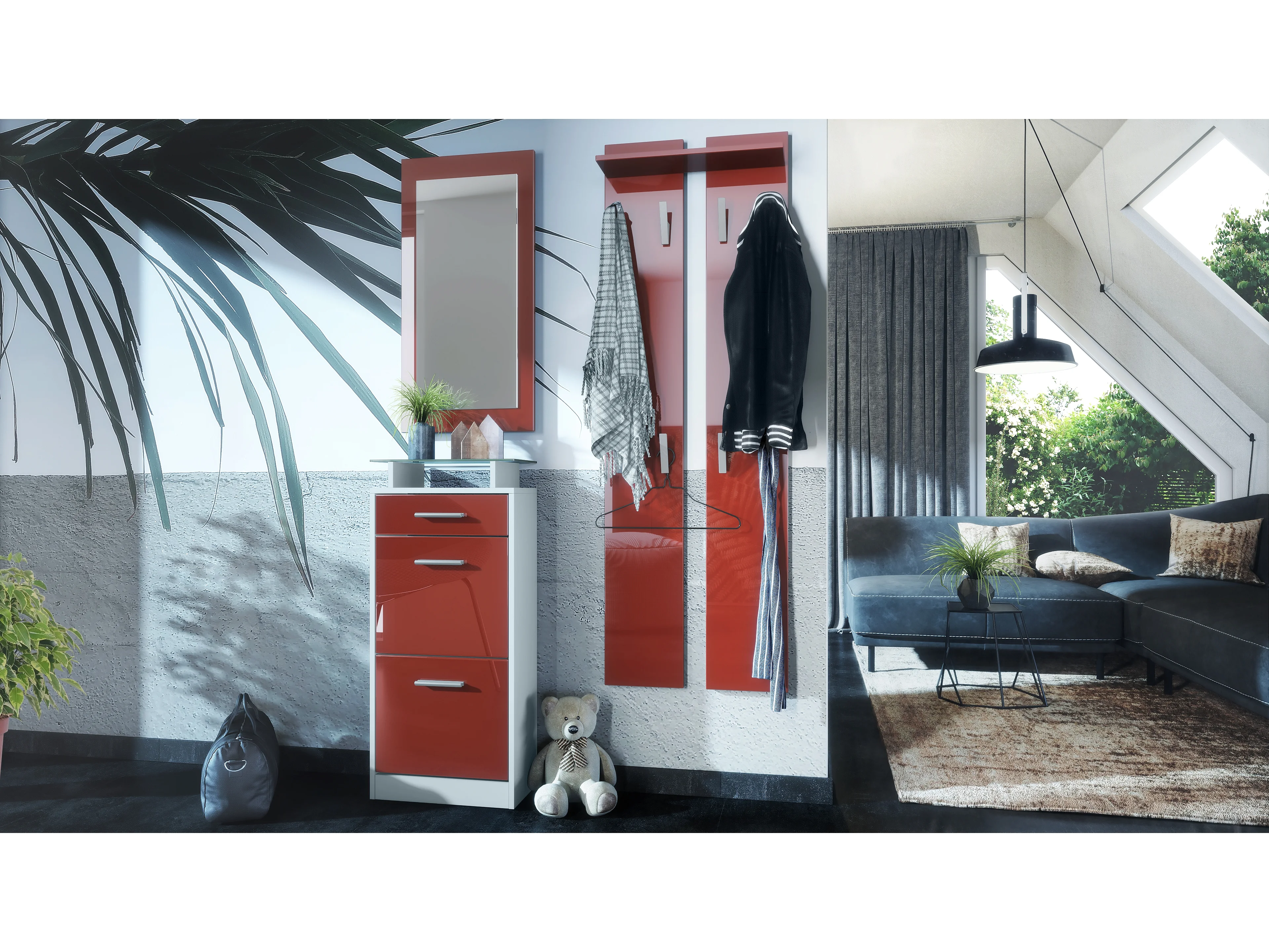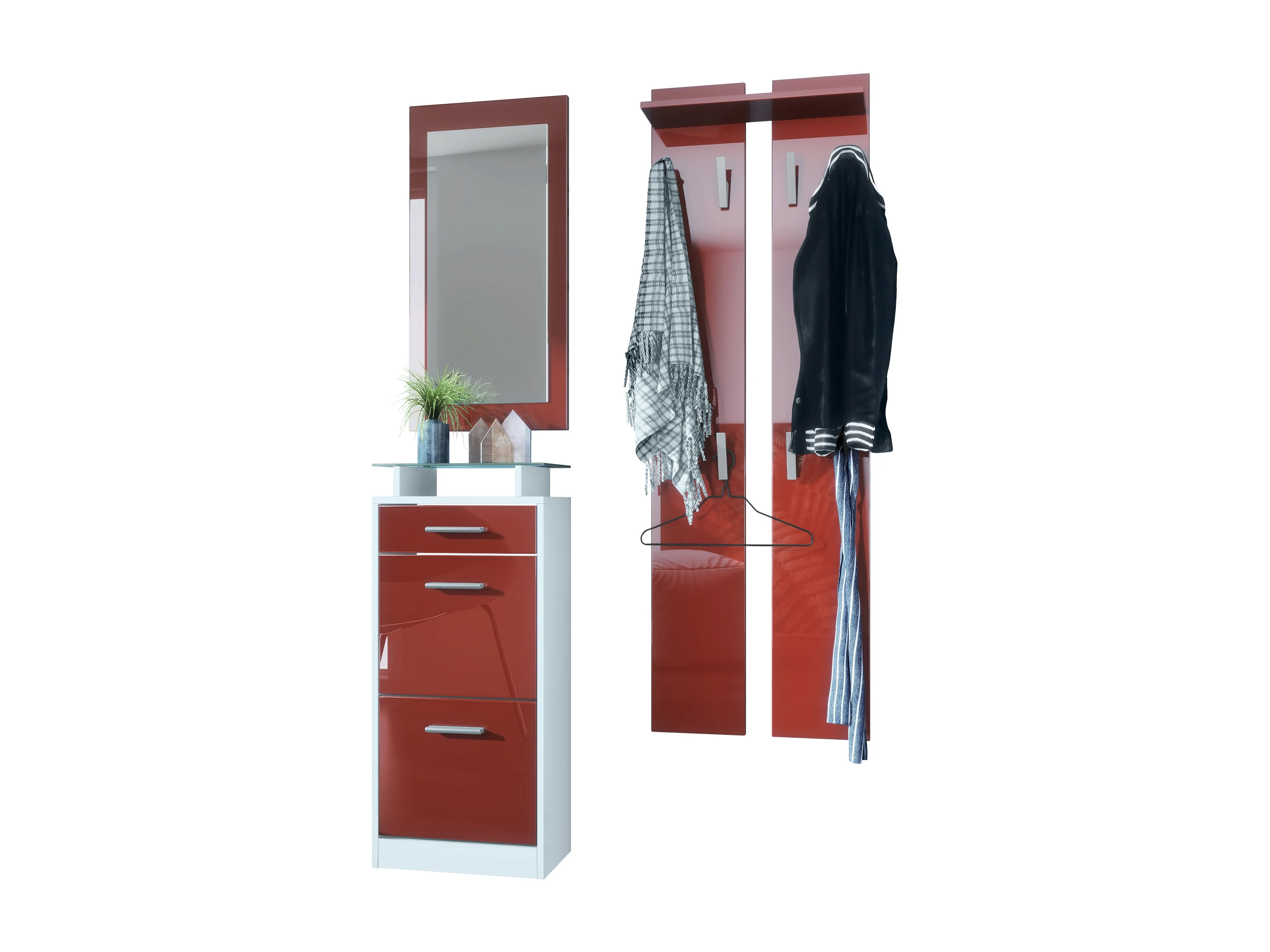 Ensemble de meubles d'entrée Loret V2 Mini, Corps en Blanc mat / Façades en Bordeaux haute brillance