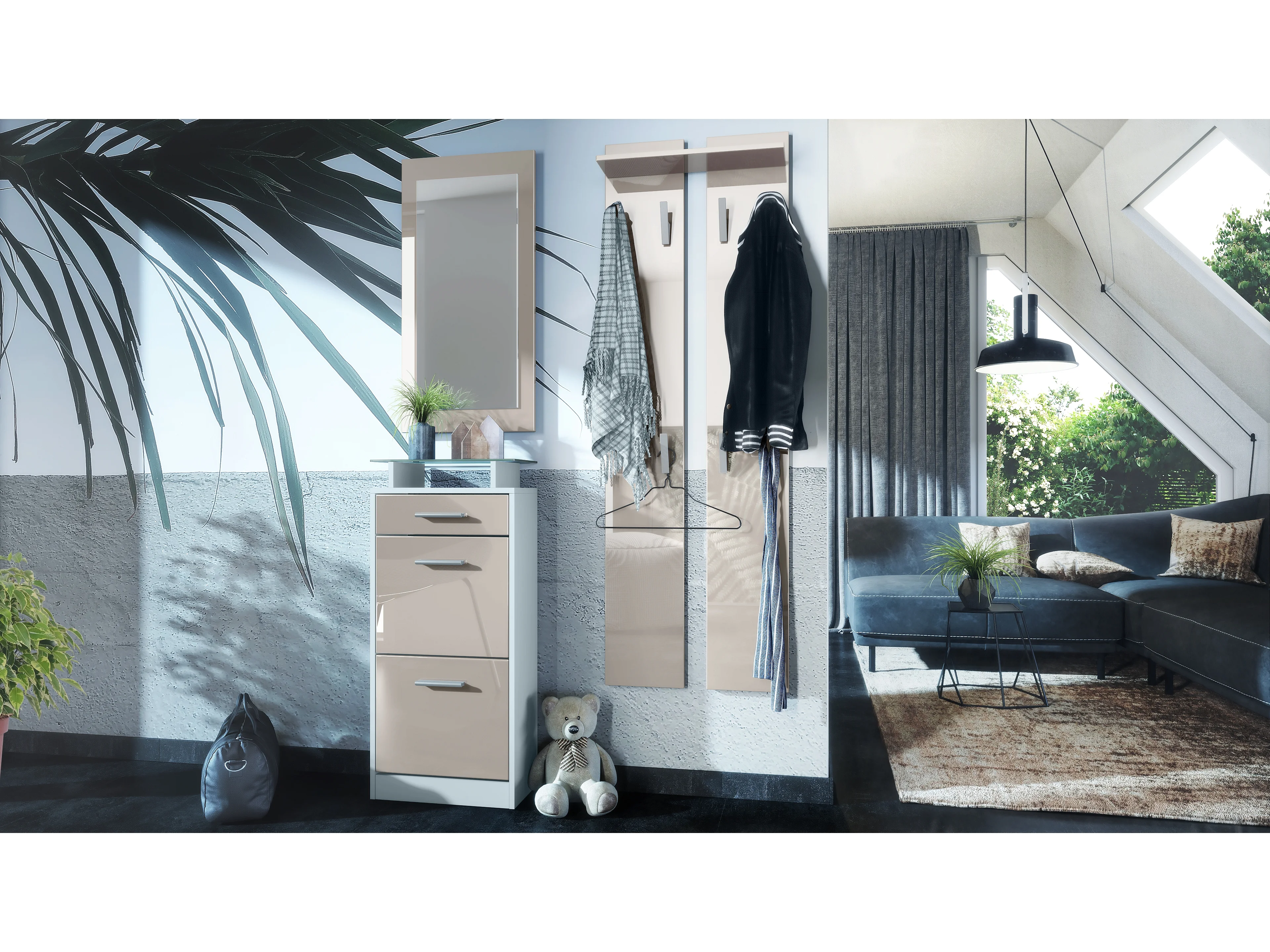Ensemble de meubles d'entrée Loret V2 Mini, Corps en Blanc mat / Façades en Gris sable haute brillance
