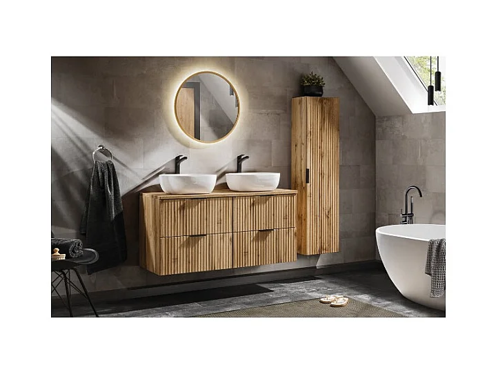 Ensemble de salle de bain NOXERA 120 cm – Chêne wotan – Double vasque, colonne et miroir LED