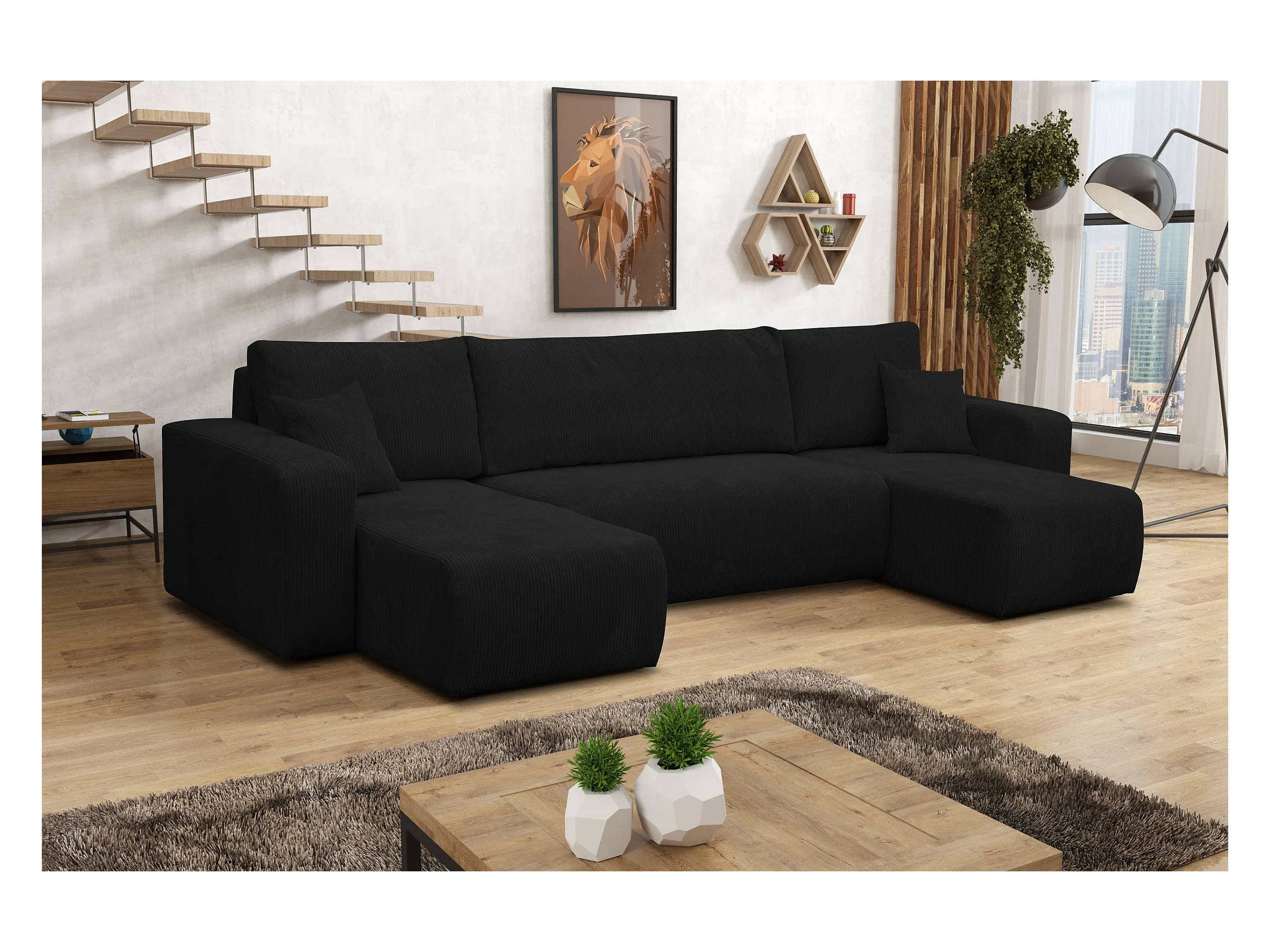 Ensemble de salon Luna U, canapé en U avec fonction couchage et coffre de rangement, couleur : noir, tissu velours