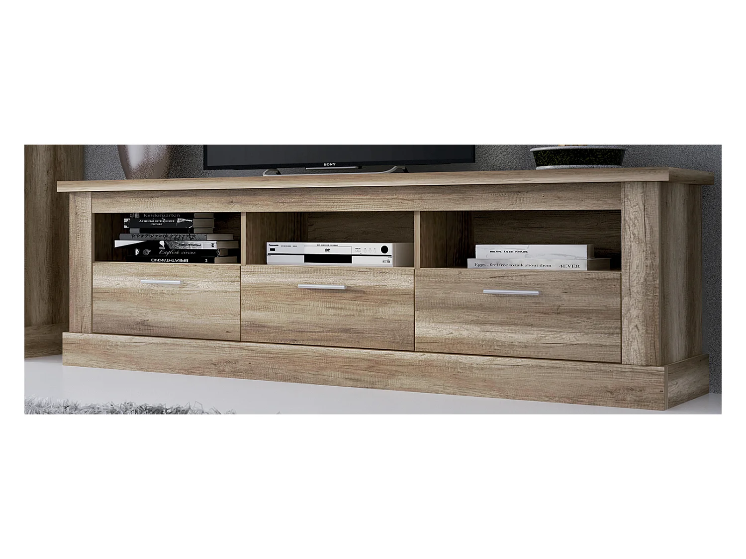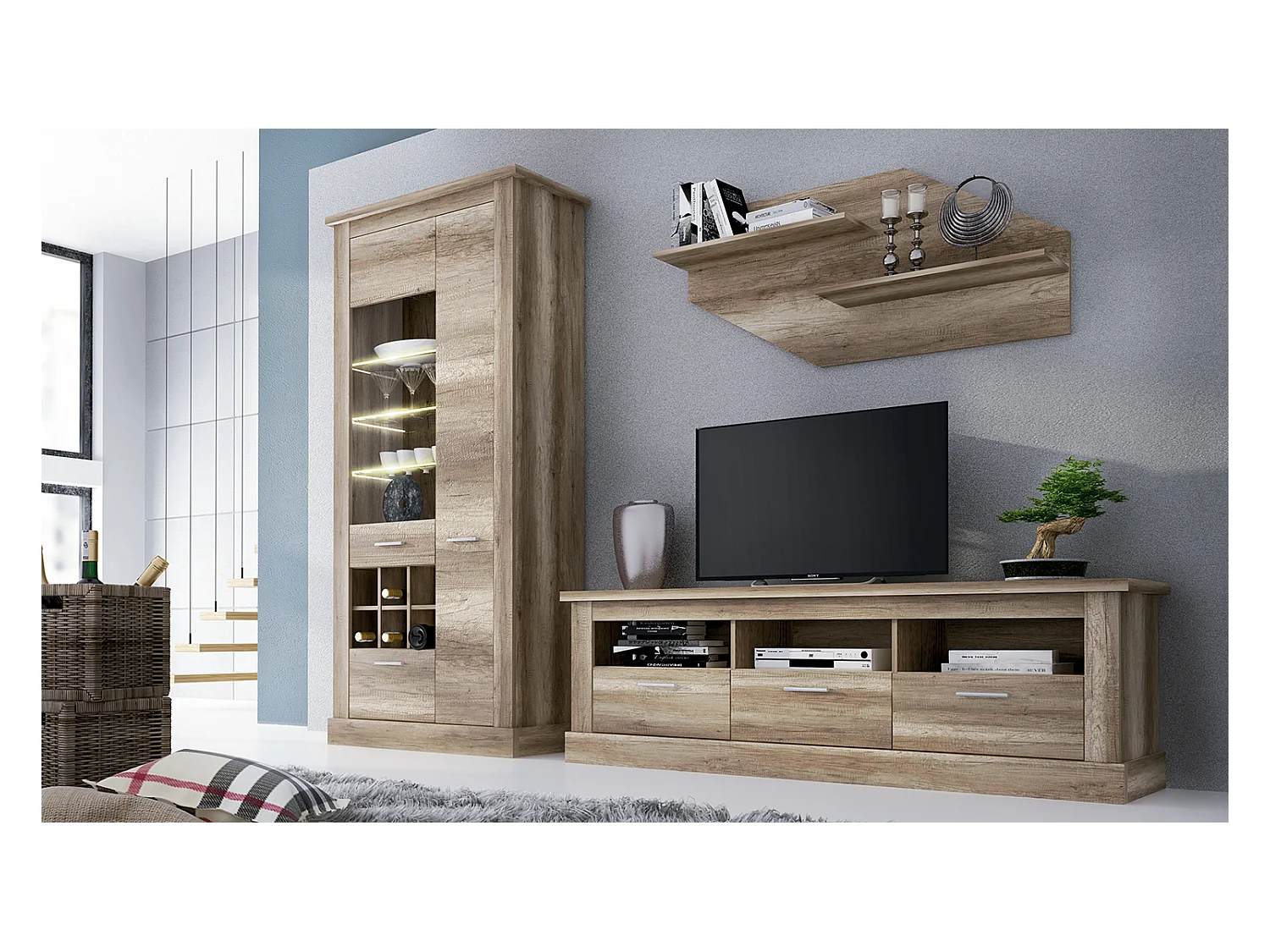 Ensemble de salon meuble TV + étagère murale + vitrine avec LED coloris chêne vieilli