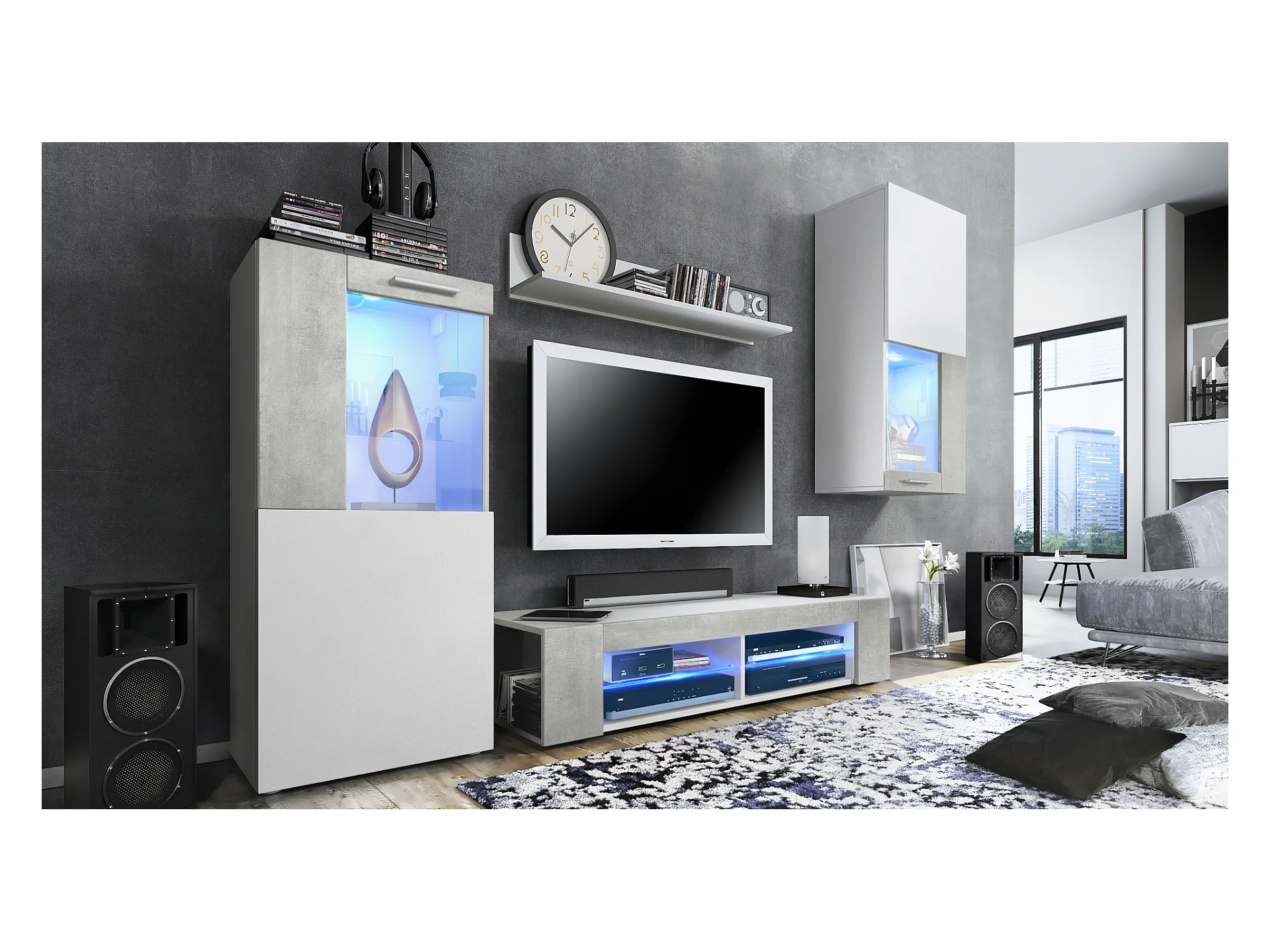 Ensemble de salon Movie comprenant 1 meuble bas TV, 2 vitrines et 1 étagère, Blanc mat/Aspect Béton Oxyde, (Dimensions totales : 300 x 190 x 39 cm)