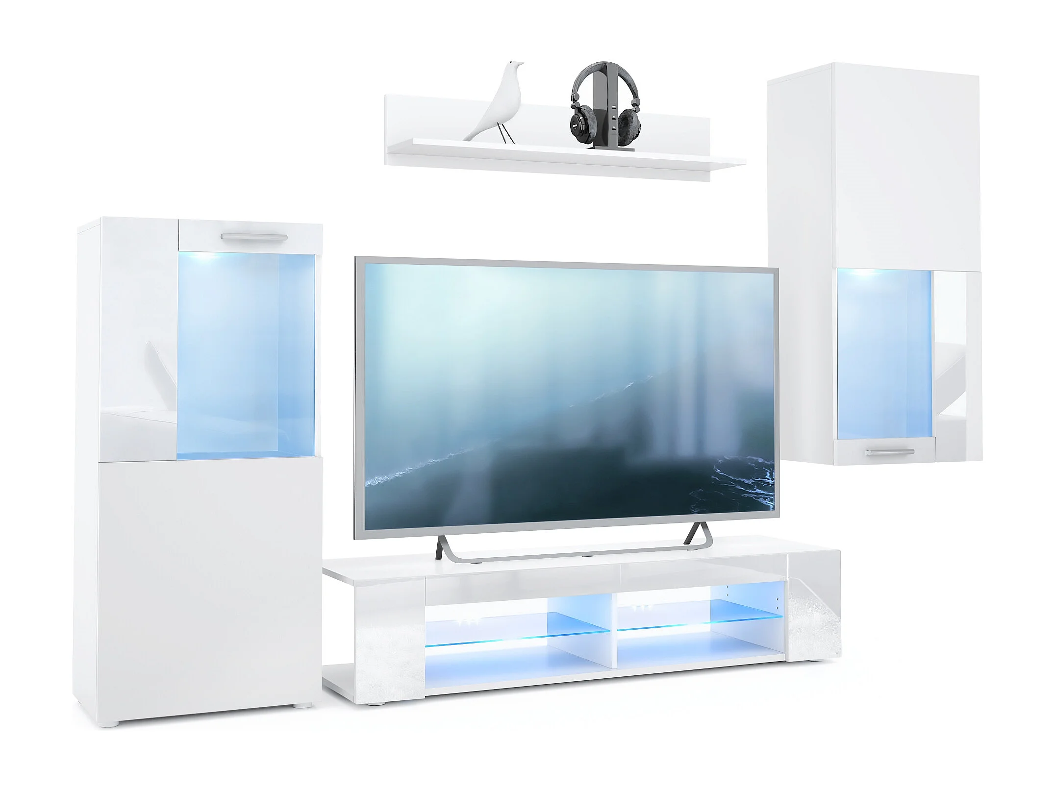 Ensemble de salon Movie comprenant 1 meuble bas TV, 2 vitrines et 1 étagère, Blanc mat/Blanc haute brillance, (Dimensions totales : 300 x 190 x 39 cm)