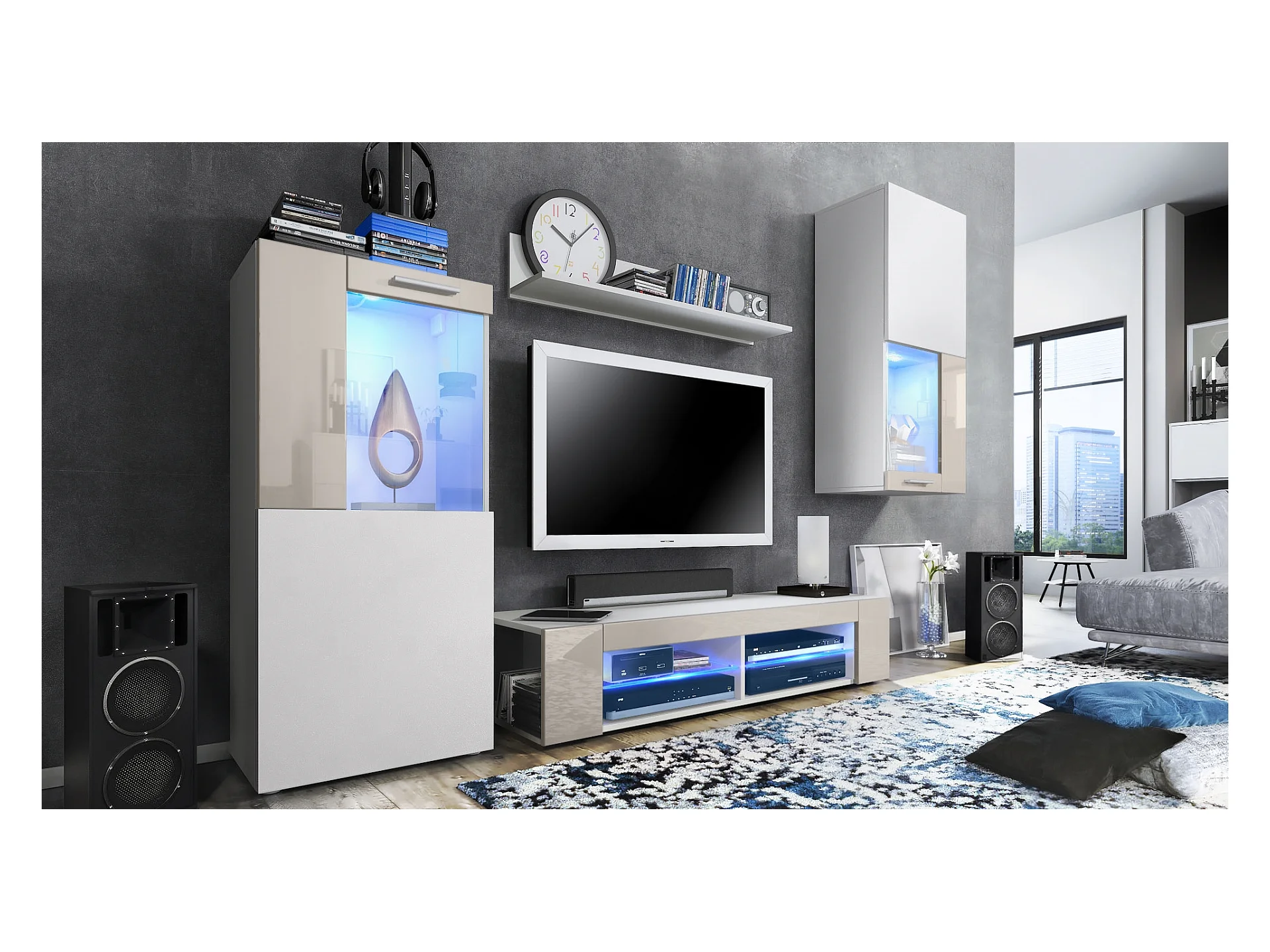 Ensemble de salon Movie comprenant 1 meuble bas TV, 2 vitrines et 1 étagère, Blanc mat/Gris sable haute brillance, (Dimensions totales : 300 x 190 x 39 cm)