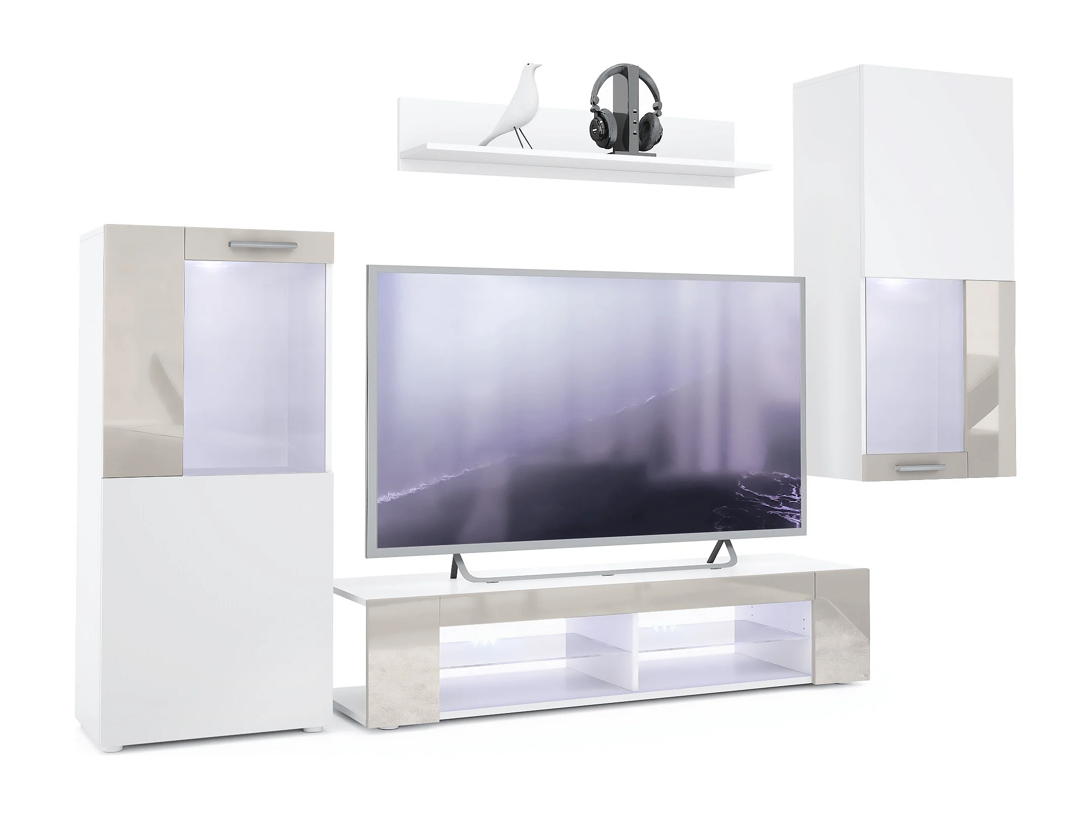 Ensemble de salon Movie comprenant 1 meuble bas TV, 2 vitrines et 1 étagère, Blanc mat/Gris sable haute brillance, (Dimensions totales : 300 x 190 x 39 cm)
