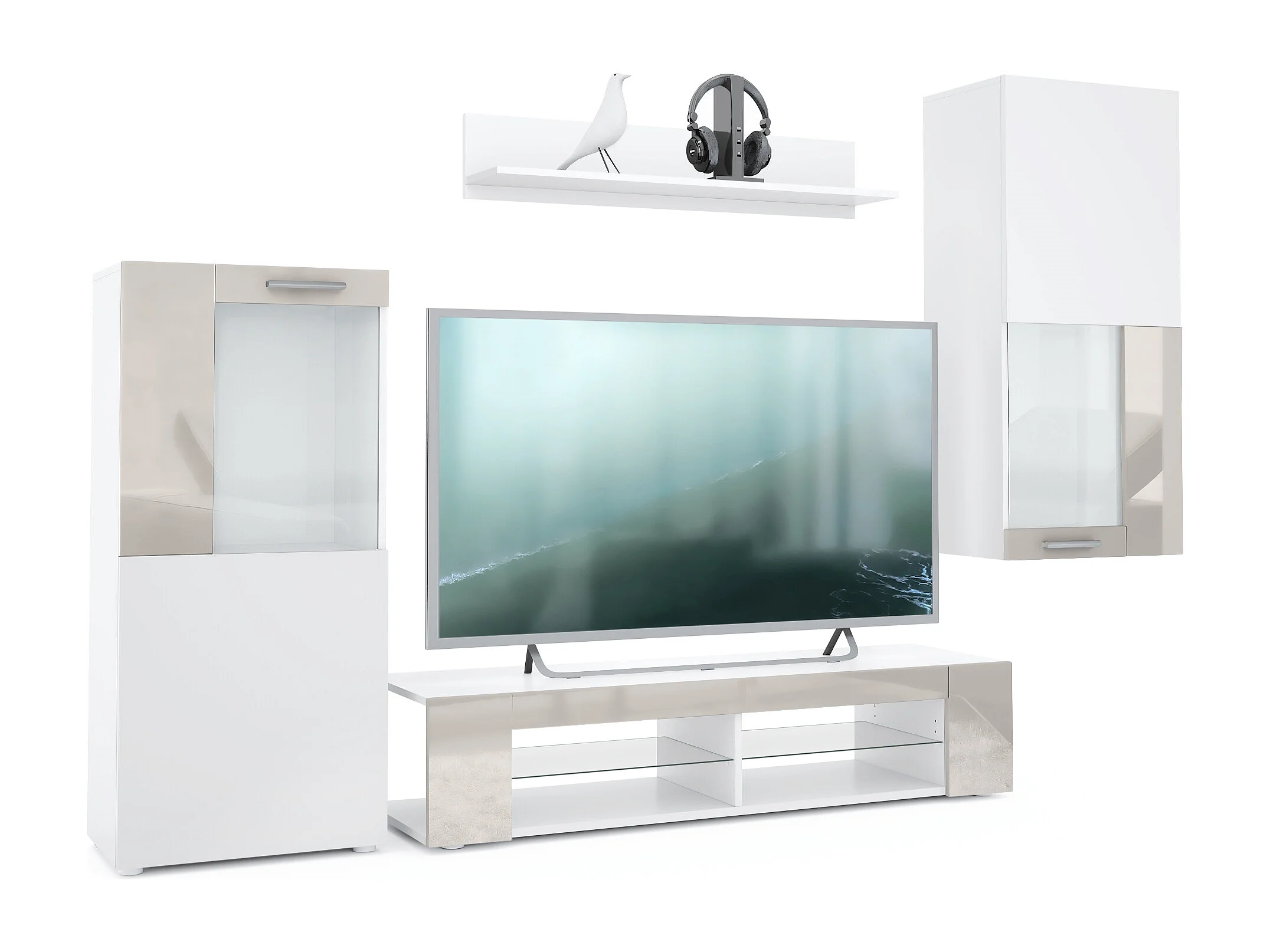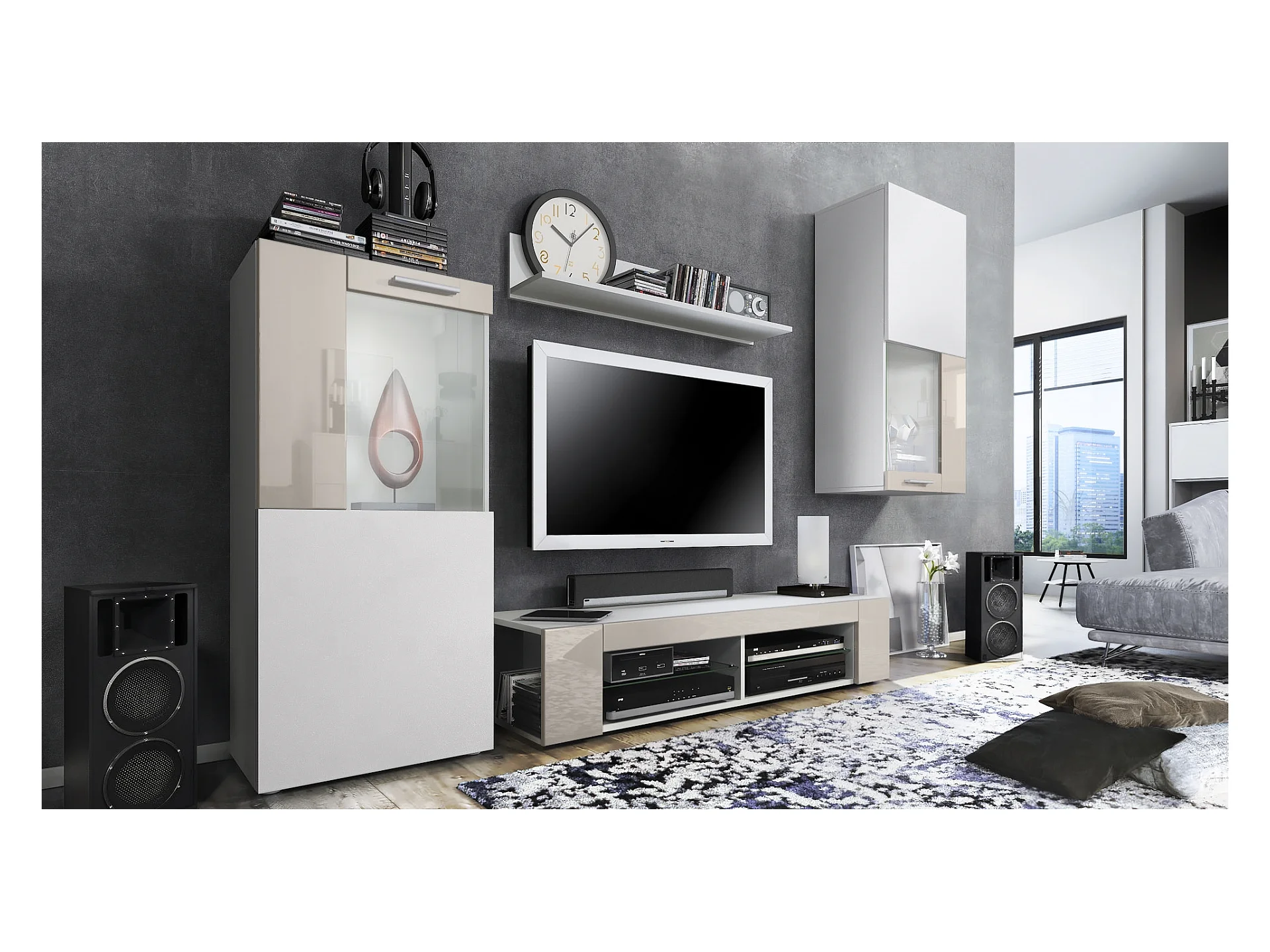 Ensemble de salon Movie comprenant 1 meuble bas TV, 2 vitrines et 1 étagère, Blanc mat/Gris sable haute brillance, (Dimensions totales : 300 x 190 x 39 cm)