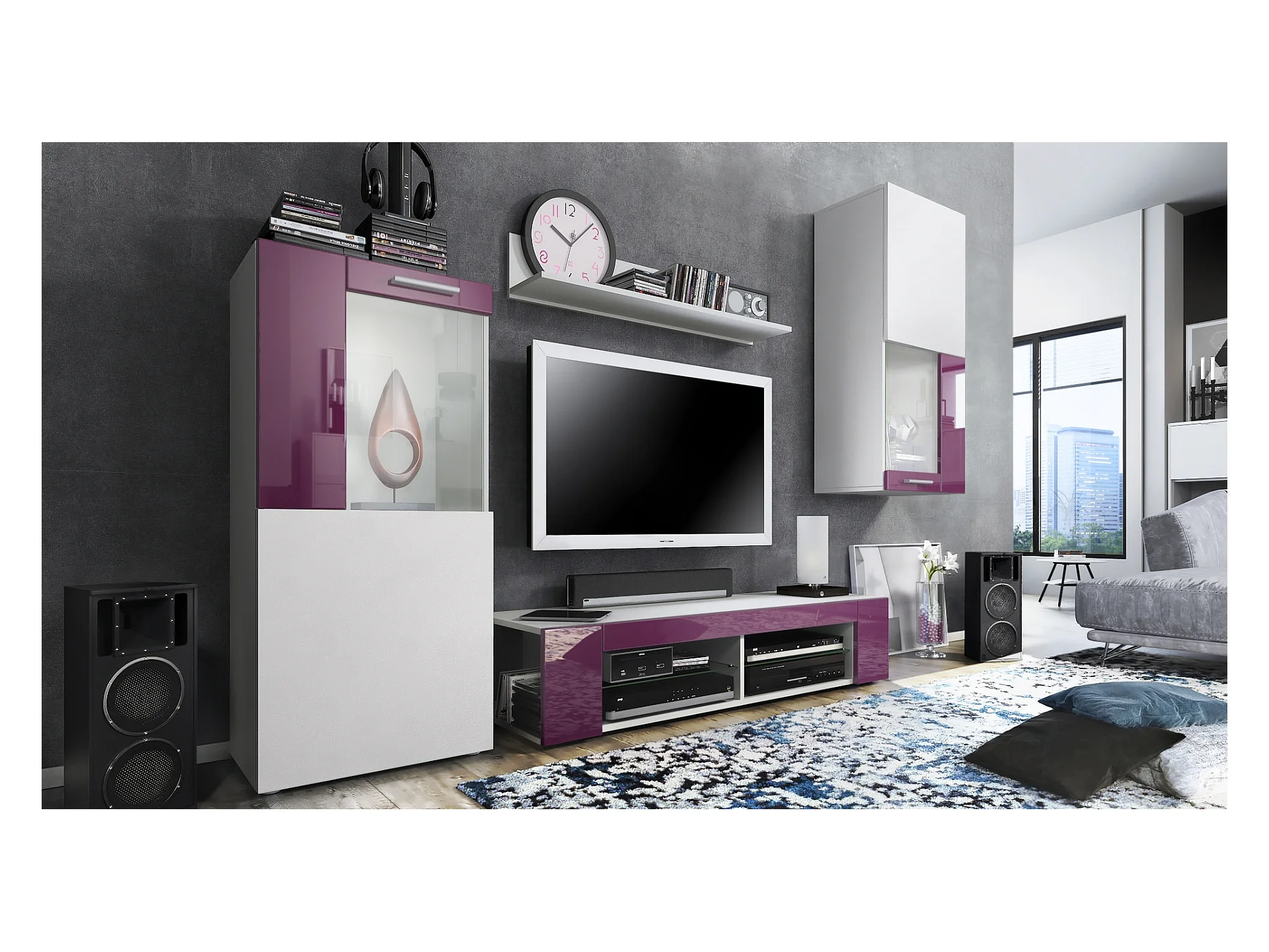 Ensemble de salon Movie comprenant 1 meuble bas TV, 2 vitrines et 1 étagère, Blanc mat/Mûre haute brillance, (Dimensions totales : 300 x 190 x 39 cm)
