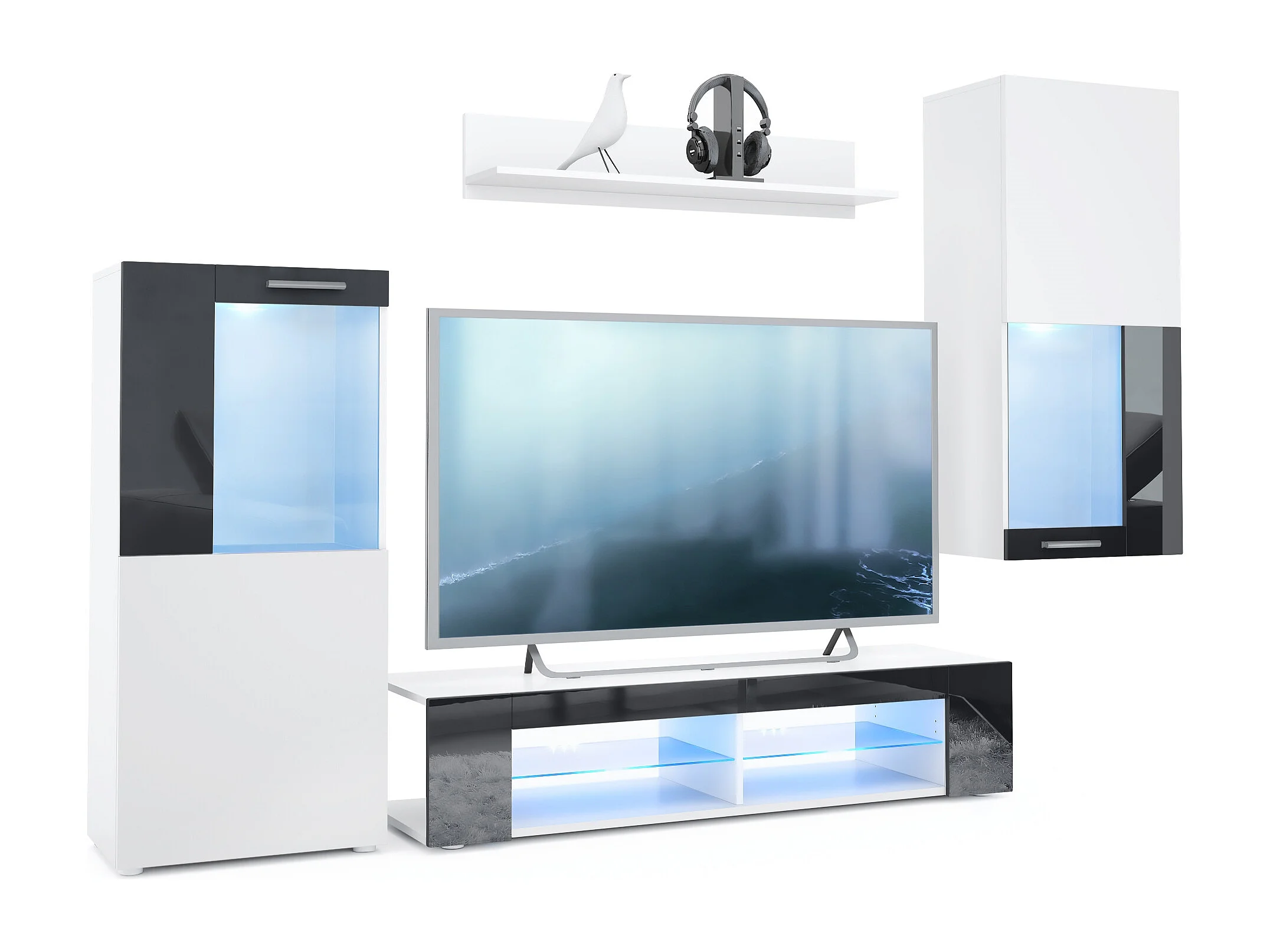 Ensemble de salon Movie comprenant 1 meuble bas TV, 2 vitrines et 1 étagère, Blanc mat/Noir haute brillance, (Dimensions totales : 300 x 190 x 39 cm)