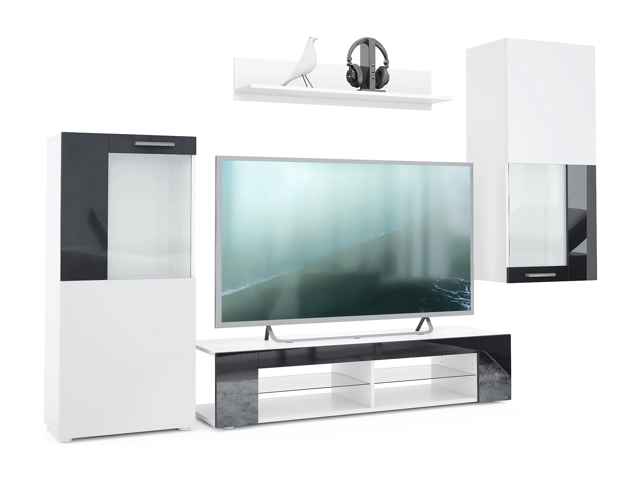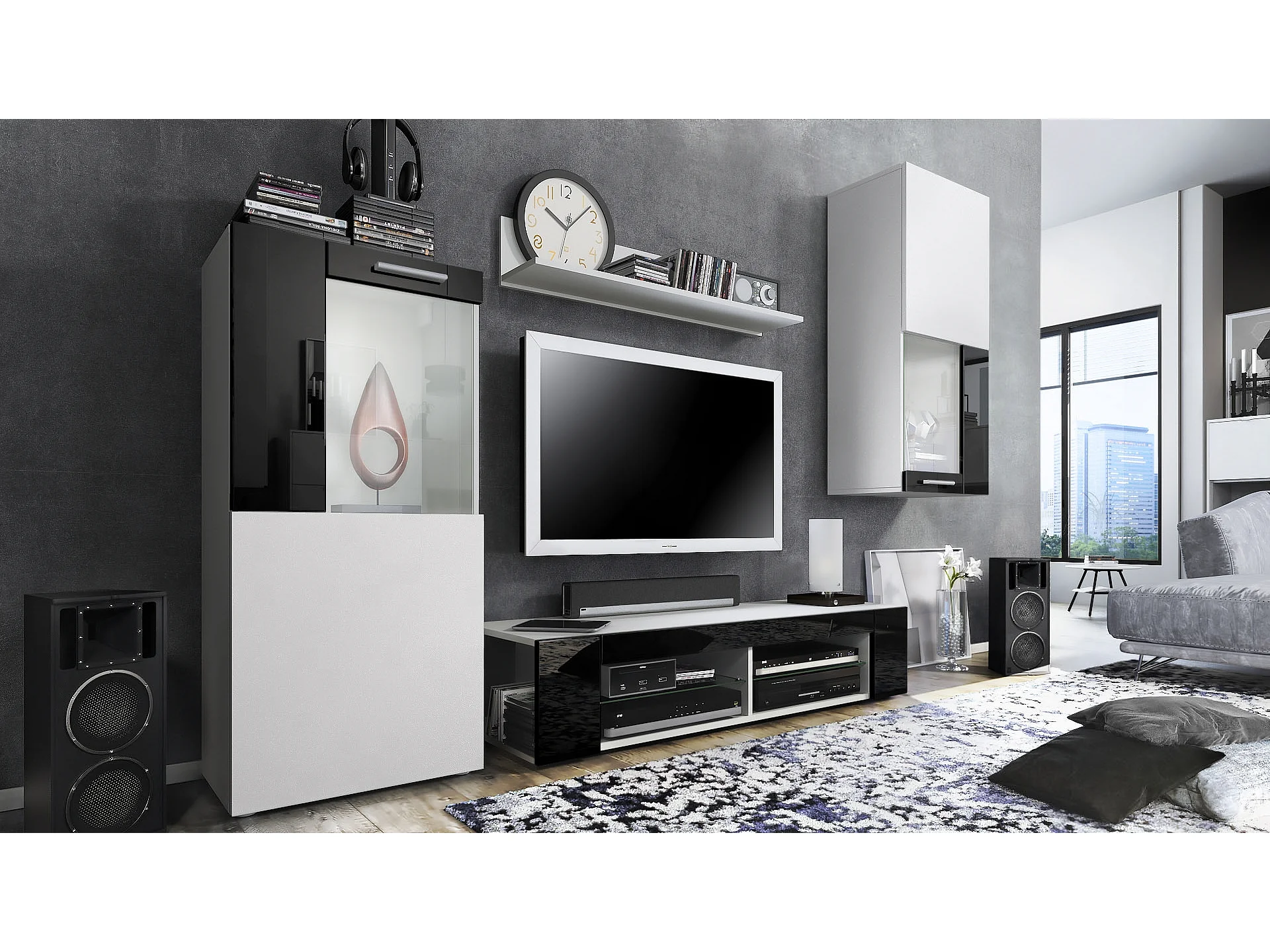 Ensemble de salon Movie comprenant 1 meuble bas TV, 2 vitrines et 1 étagère, Blanc mat/Noir haute brillance, (Dimensions totales : 300 x 190 x 39 cm)