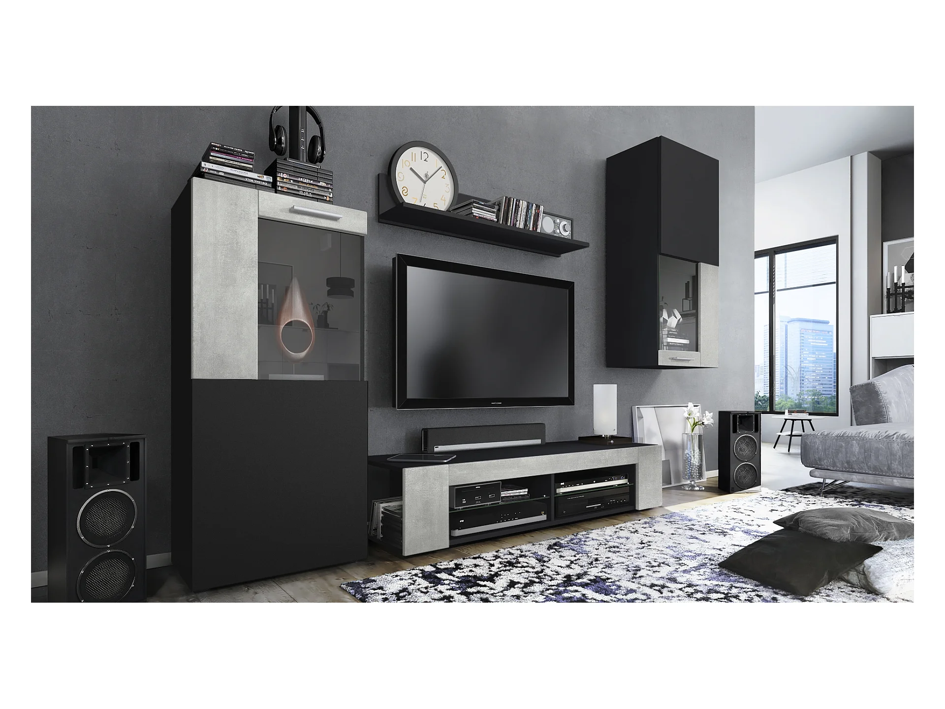 Ensemble de salon Movie comprenant 1 meuble bas TV, 2 vitrines et 1 étagère, Noir mat/Aspect Béton Oxyde, (Dimensions totales : 300 x 190 x 39 cm)