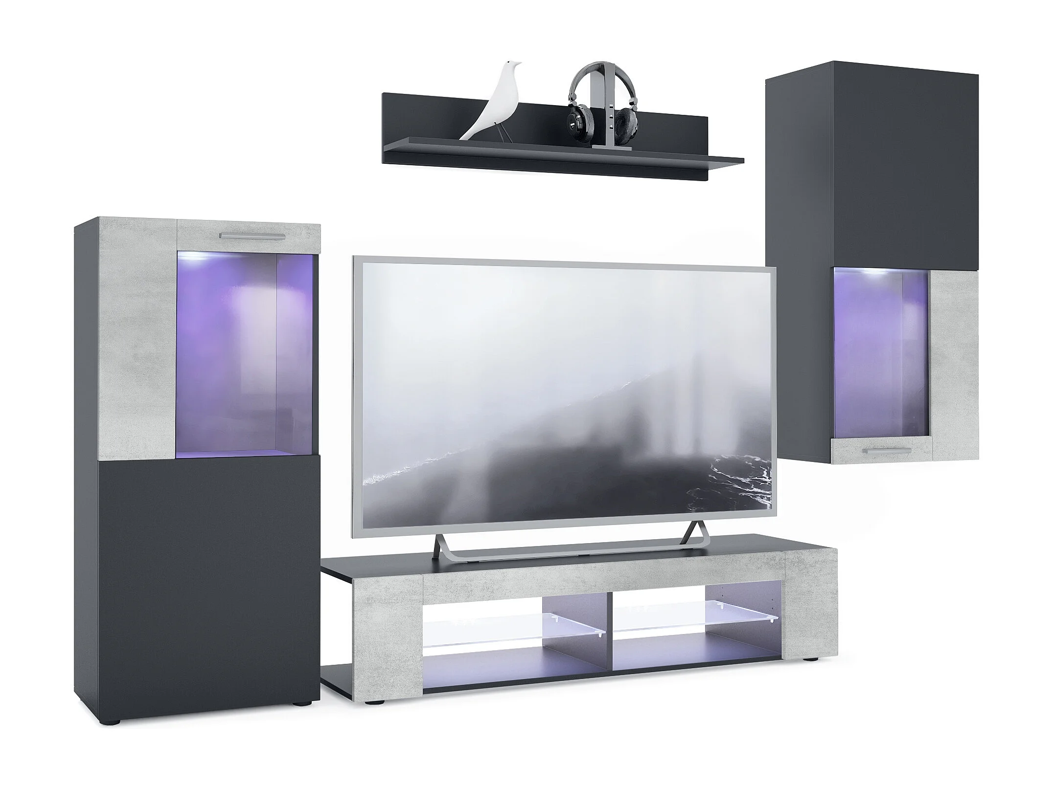 Ensemble de salon Movie comprenant 1 meuble bas TV, 2 vitrines et 1 étagère, Noir mat/Aspect Béton Oxyde, (Dimensions totales : 300 x 190 x 39 cm)