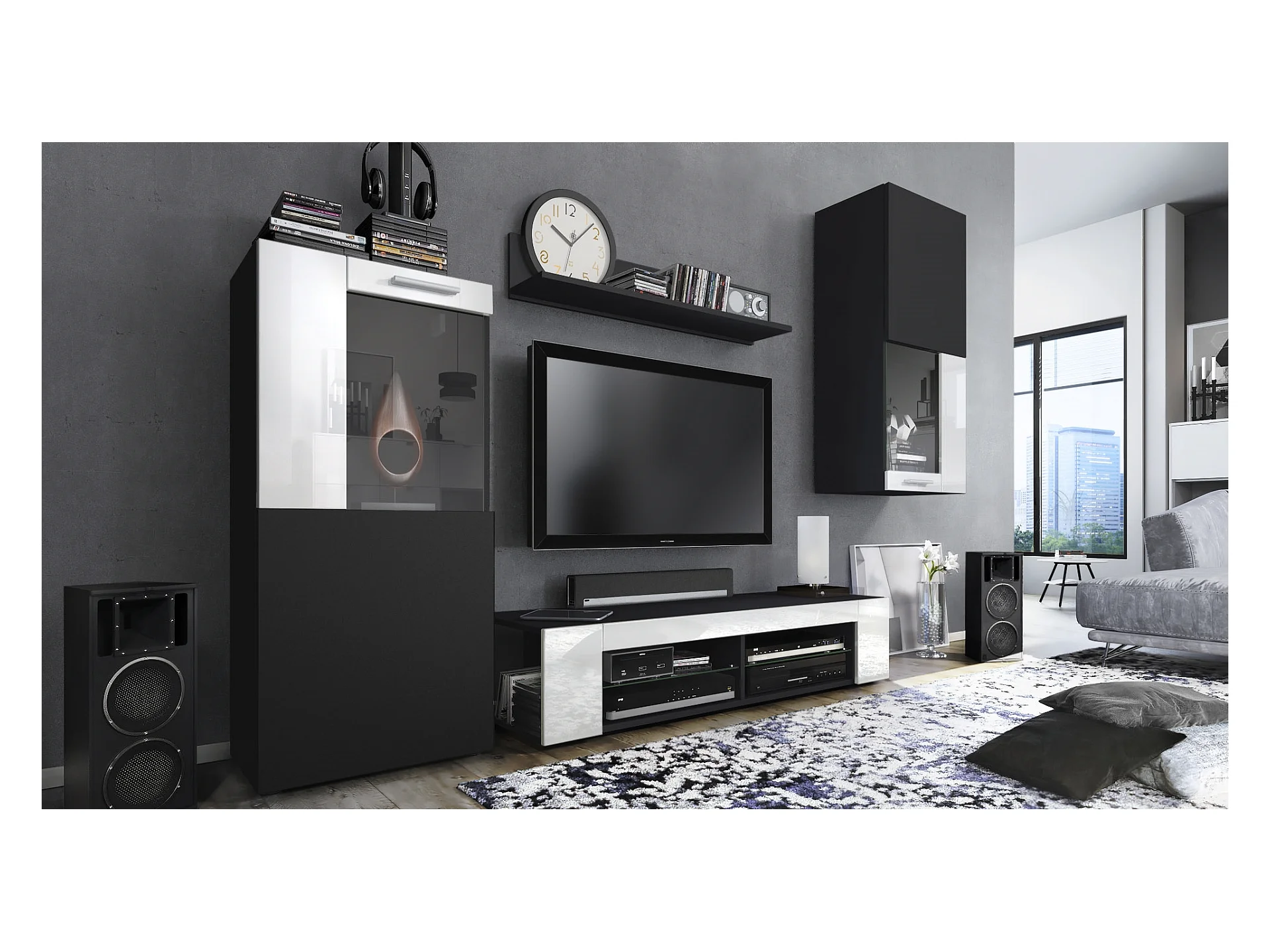 Ensemble de salon Movie comprenant 1 meuble bas TV, 2 vitrines et 1 étagère, Noir mat/Blanc haute brillance, (Dimensions totales : 300 x 190 x 39 cm)