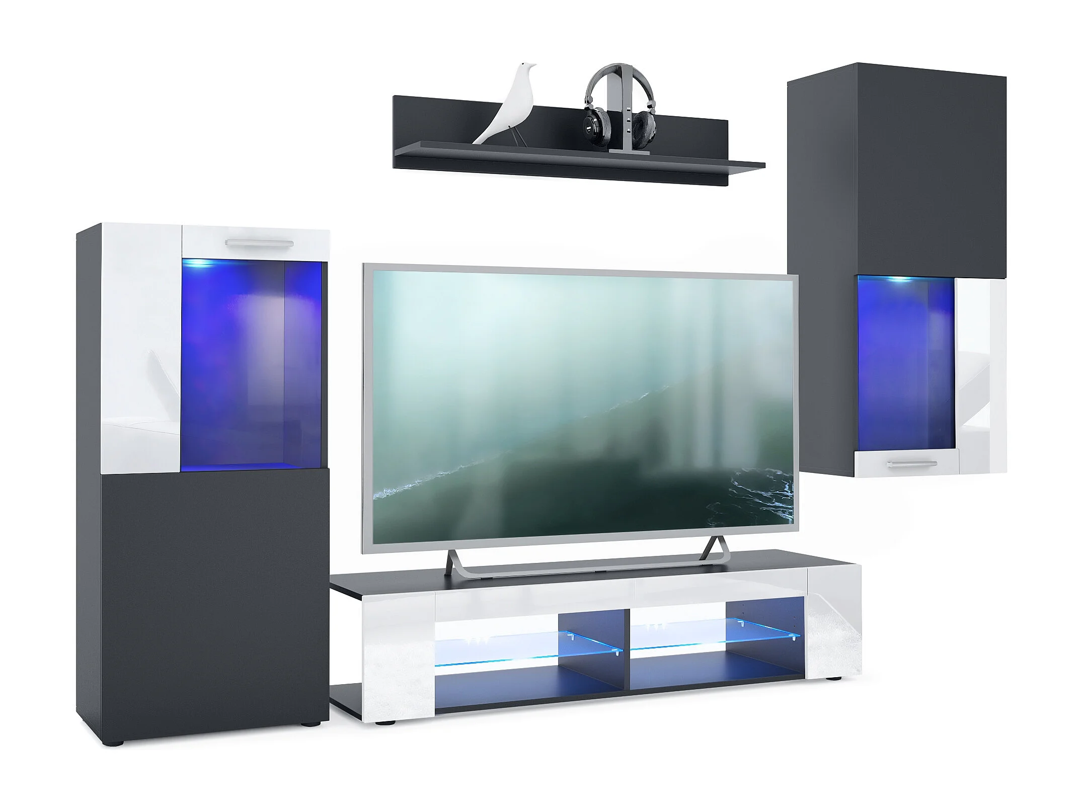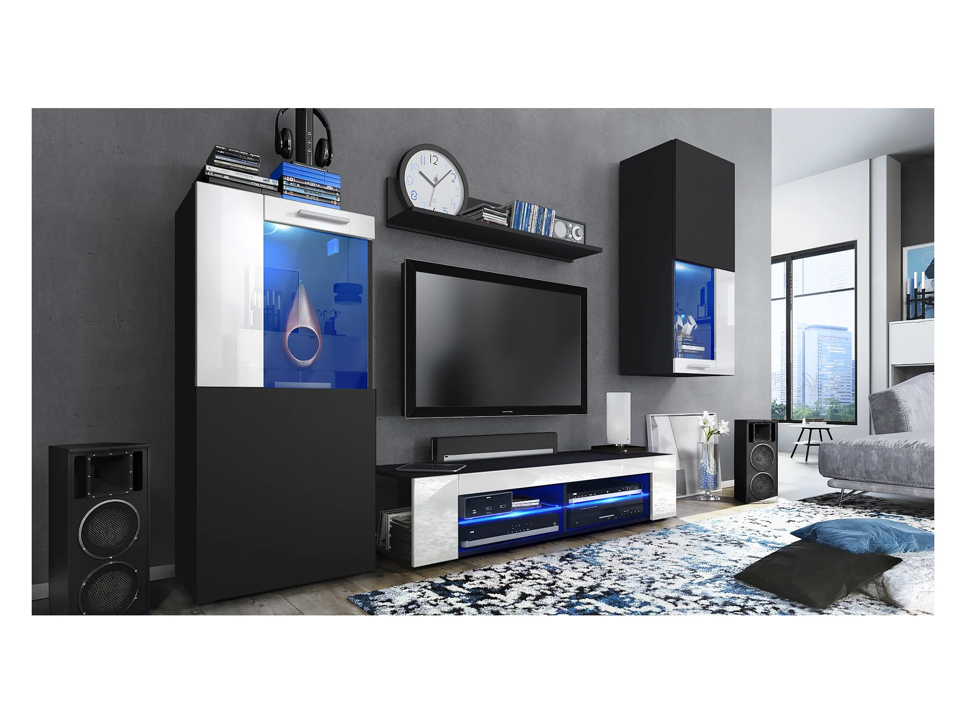 Ensemble de salon Movie comprenant 1 meuble bas TV, 2 vitrines et 1 étagère, Noir mat/Blanc haute brillance, (Dimensions totales : 300 x 190 x 39 cm)