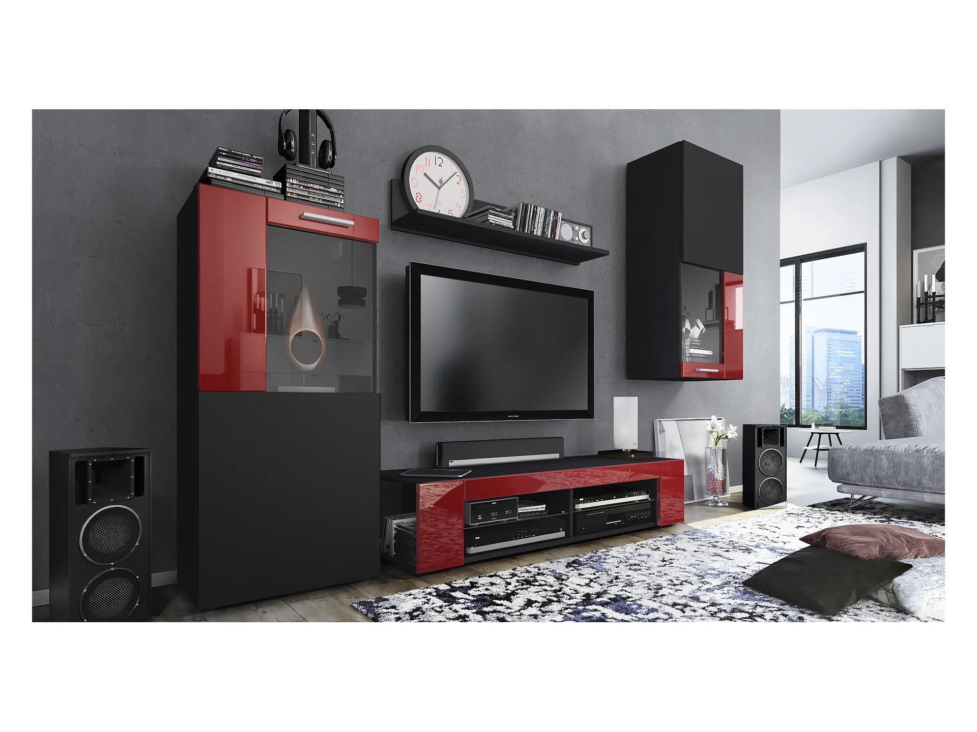 Ensemble de salon Movie comprenant 1 meuble bas TV, 2 vitrines et 1 étagère, Noir mat/Bordeaux haute brillance, (Dimensions totales : 300 x 190 x 39 cm)
