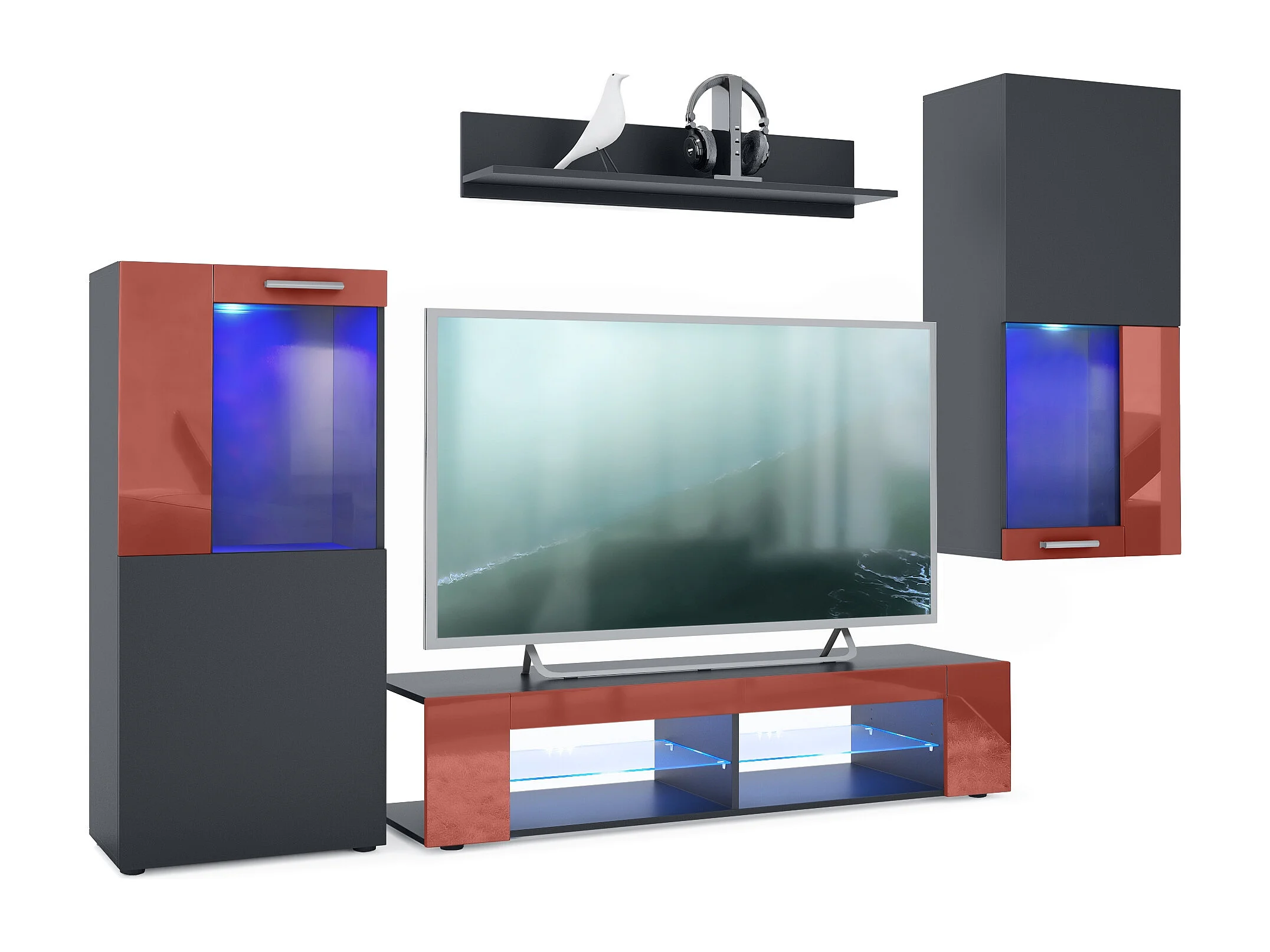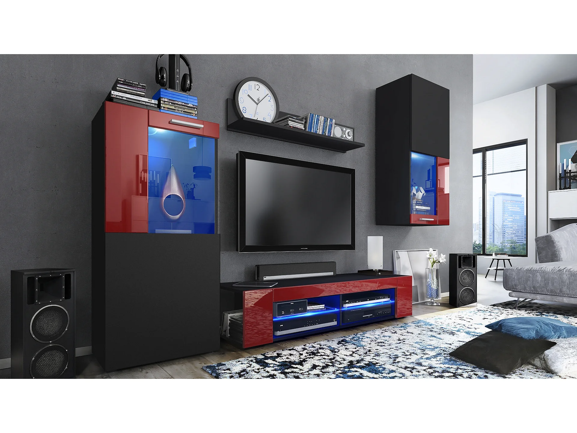 Ensemble de salon Movie comprenant 1 meuble bas TV, 2 vitrines et 1 étagère, Noir mat/Bordeaux haute brillance, (Dimensions totales : 300 x 190 x 39 cm)