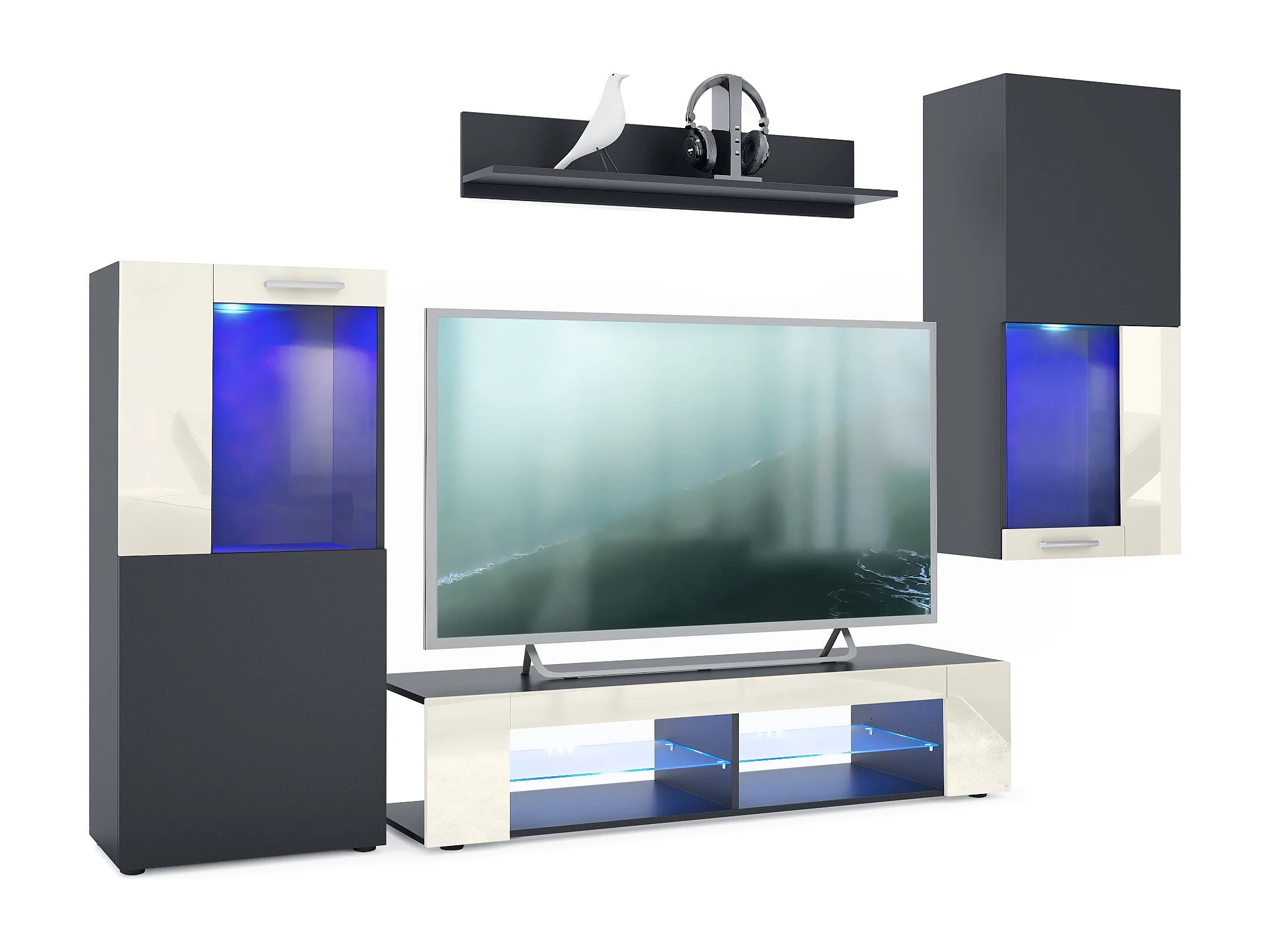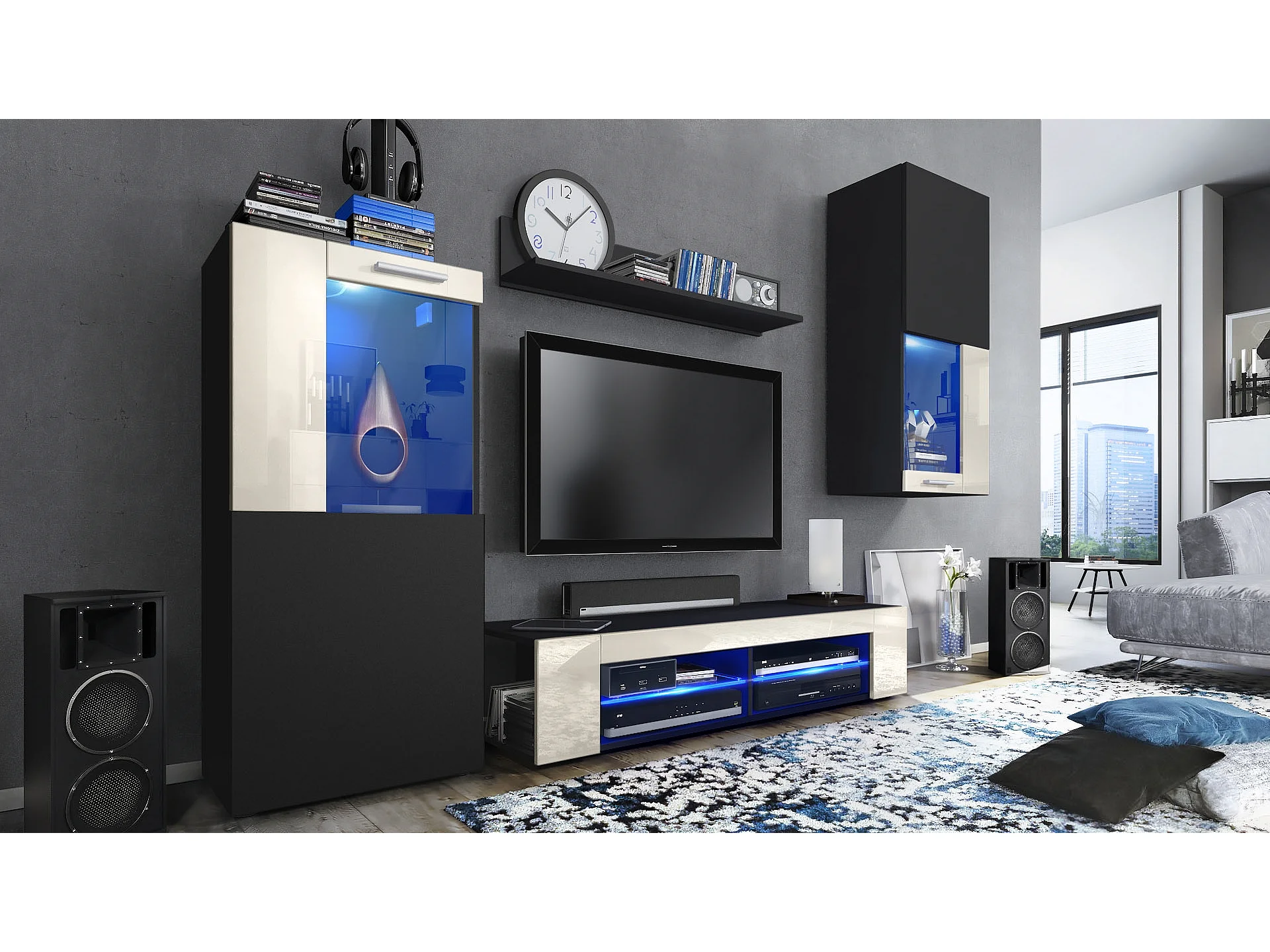 Ensemble de salon Movie comprenant 1 meuble bas TV, 2 vitrines et 1 étagère, Noir mat/Crème haute brillance, (Dimensions totales : 300 x 190 x 39 cm)