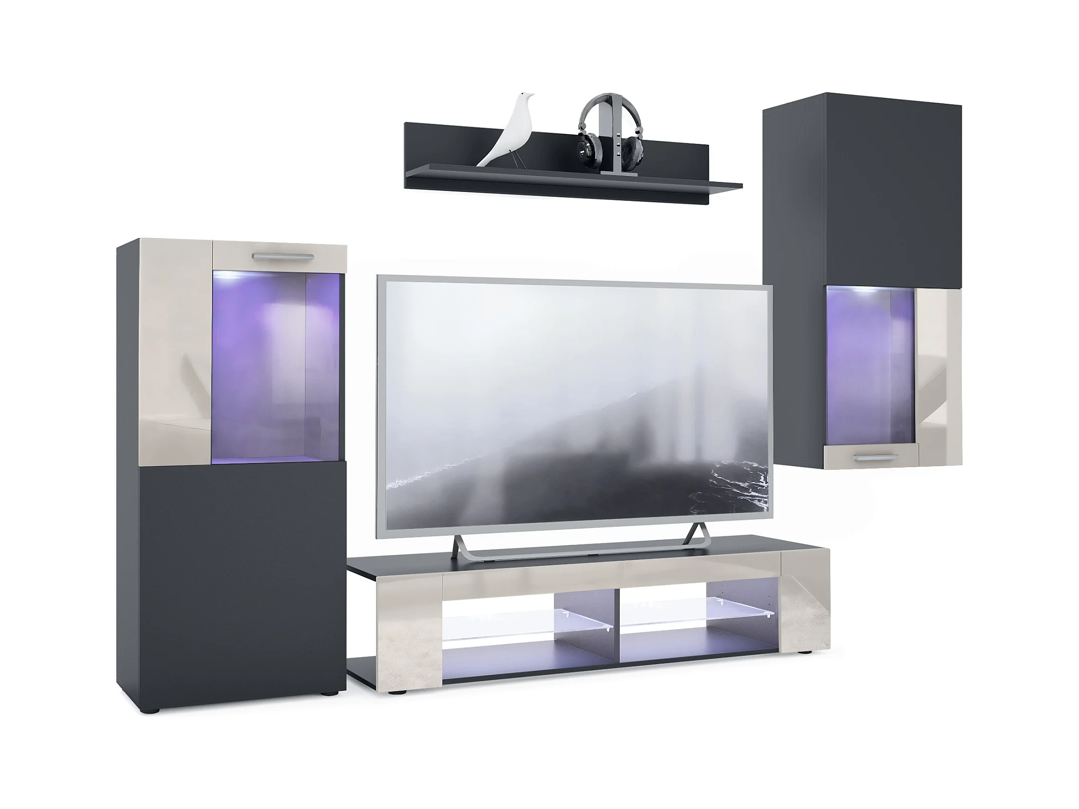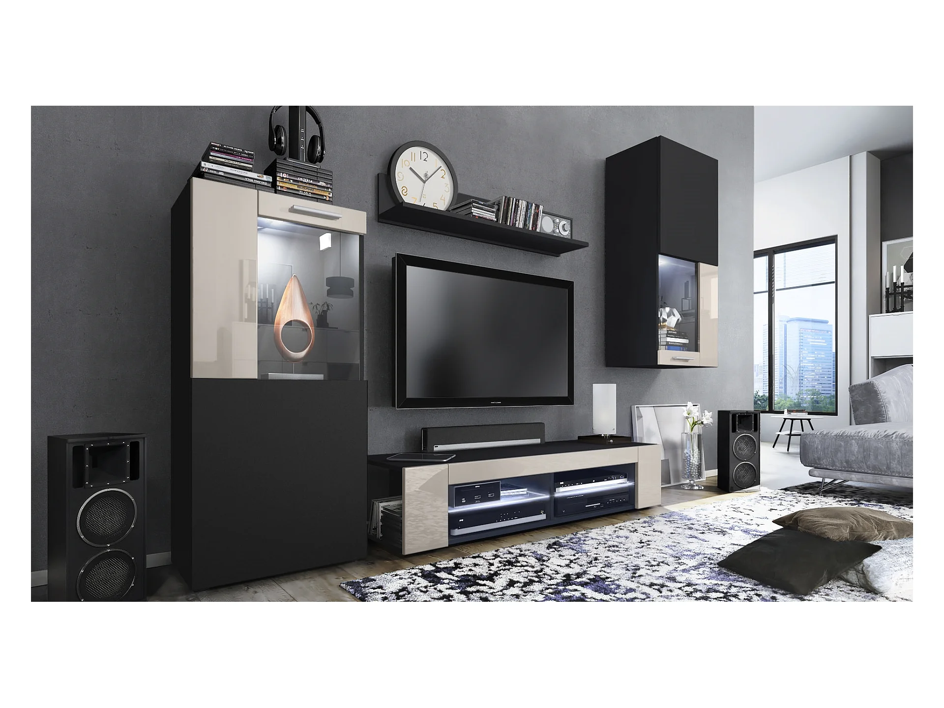 Ensemble de salon Movie comprenant 1 meuble bas TV, 2 vitrines et 1 étagère, Noir mat/Gris sable haute brillance, (Dimensions totales : 300 x 190 x 39 cm)