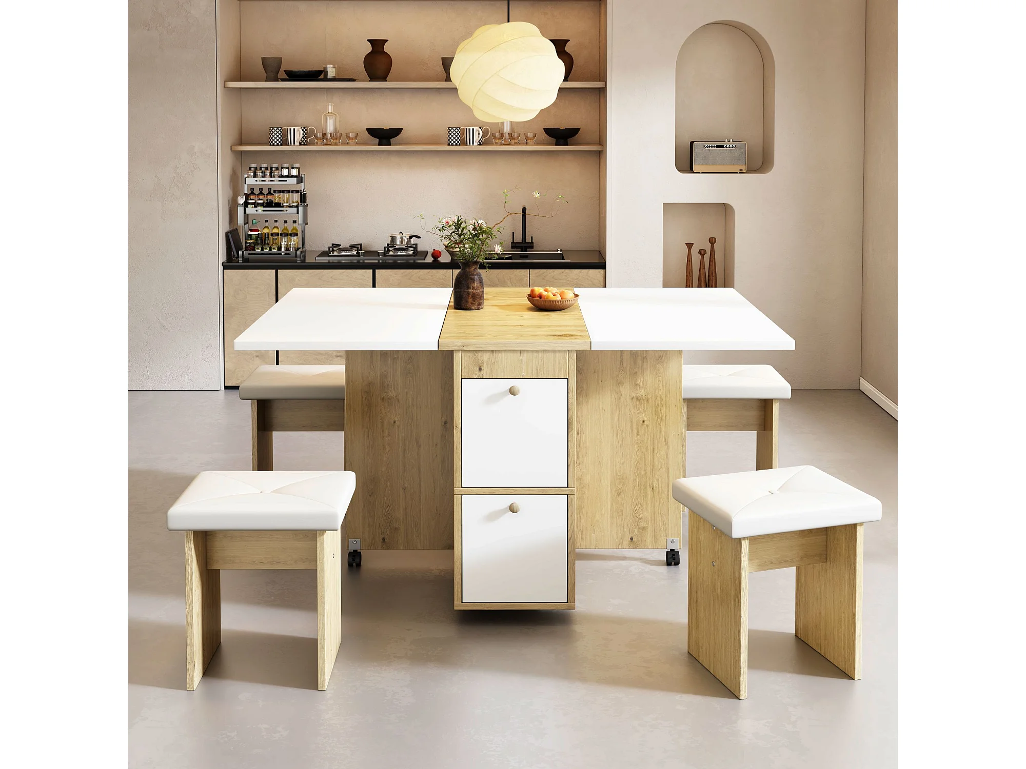 Ensemble de table à manger rétractable pliable (avec table à manger, 4 chaises), 120 * 80 * 75cm, chêne blanc
