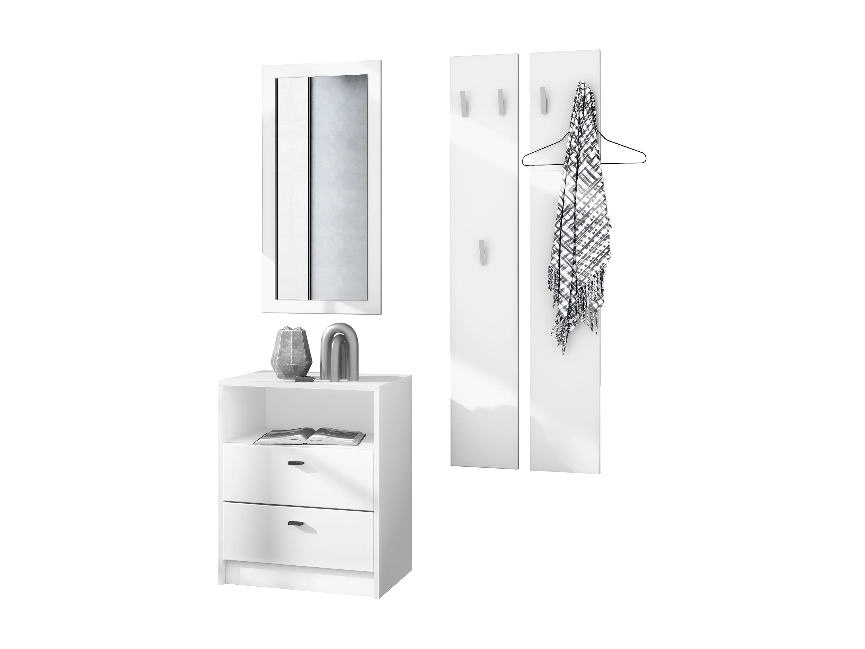 Ensemble de vestiaires Pino V1, 2 Panneaux muraux 140 cm et buffet avec 2 tiroirs & 1 compartiment ouvert, blanc mat/blanc mat (56 x 67,5 x 36 cm)