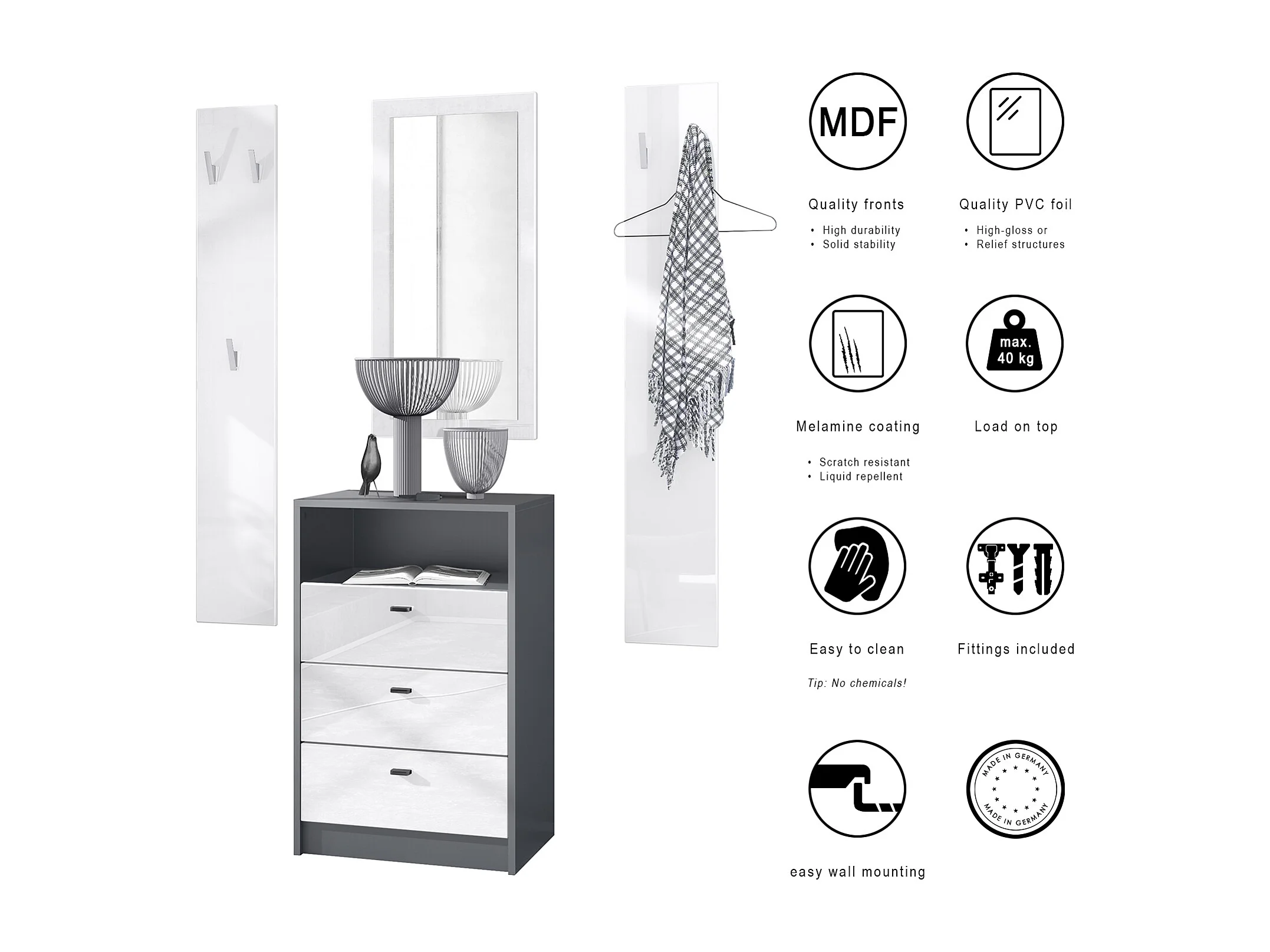 Ensemble de vestiaires Pino V2, 2 Panneaux muraux 140 cm et buffet avec 2 tiroirs & 1 compartiment ouvert, anthracite mat/gris brillant (56 x 67,5 x 36 cm)