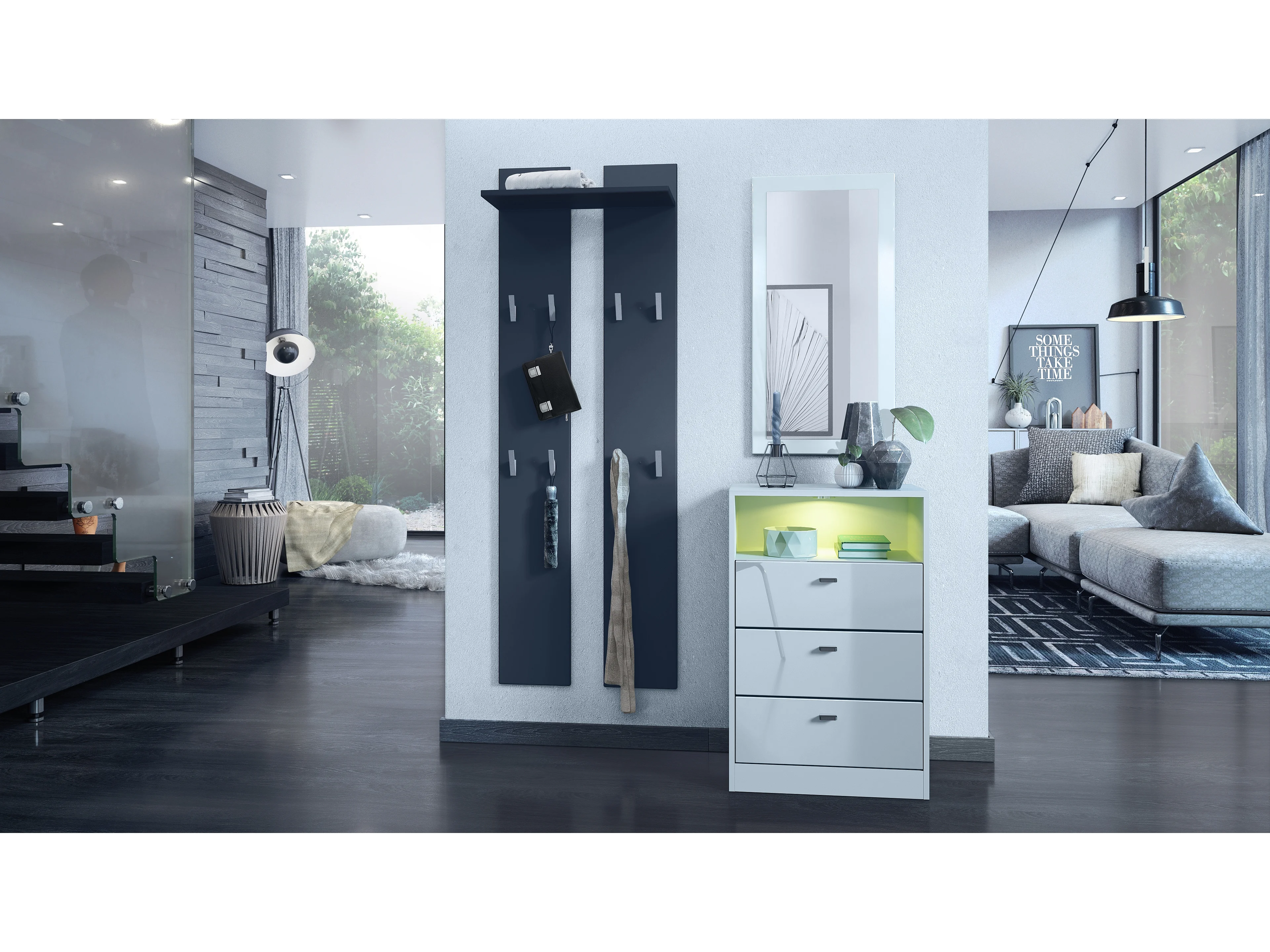 Ensemble de vestiaires Pino V2, 2 Panneaux muraux 140 cm et buffet avec 2 tiroirs & 1 compartiment ouvert, blanc mat/Blanc brillant (56 x 67,5 x 36 cm)