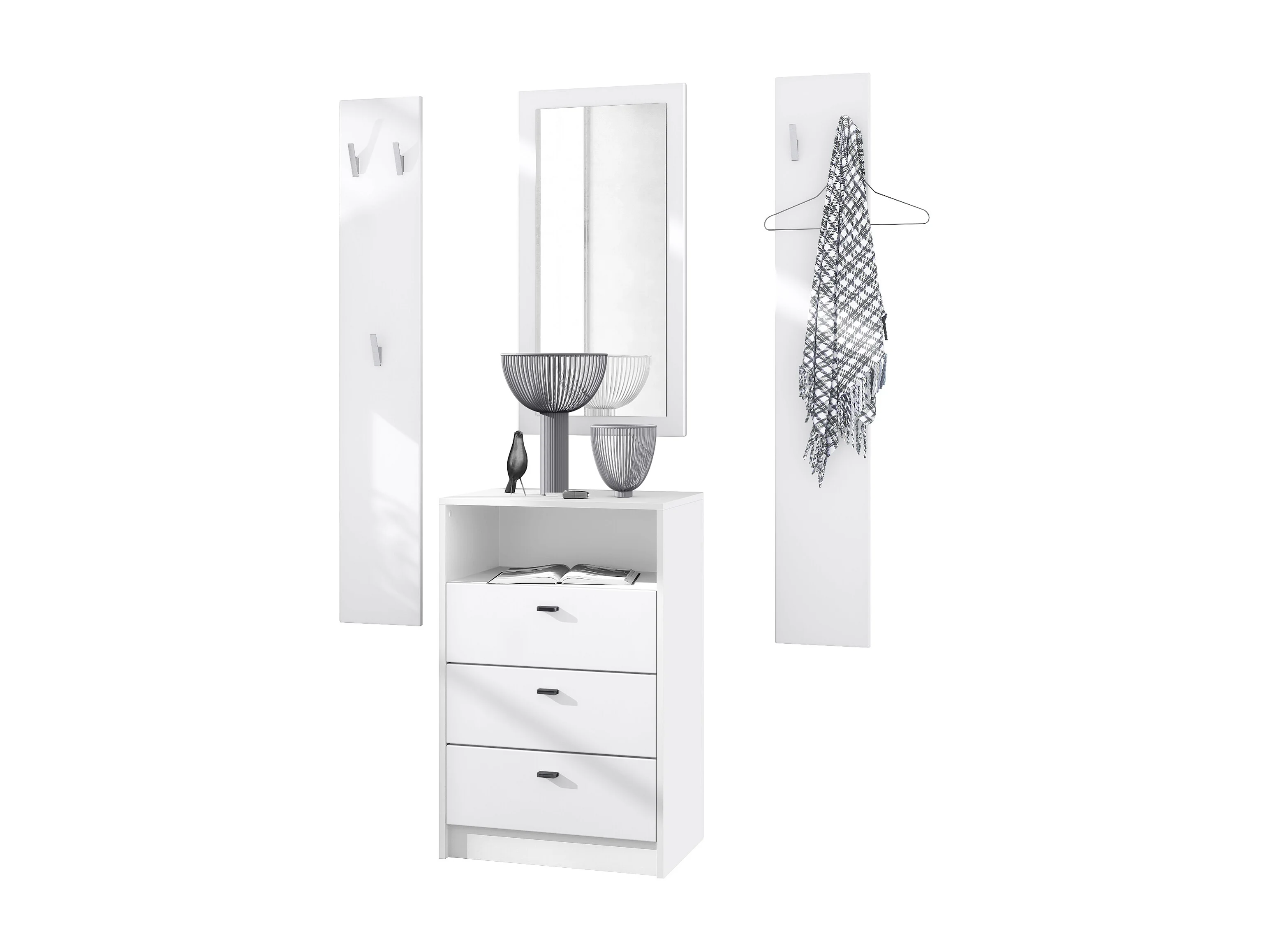 Ensemble de vestiaires Pino V2, 2 Panneaux muraux 140 cm et buffet avec 2 tiroirs & 1 compartiment ouvert, blanc mat/blanc mat (56 x 67,5 x 36 cm)
