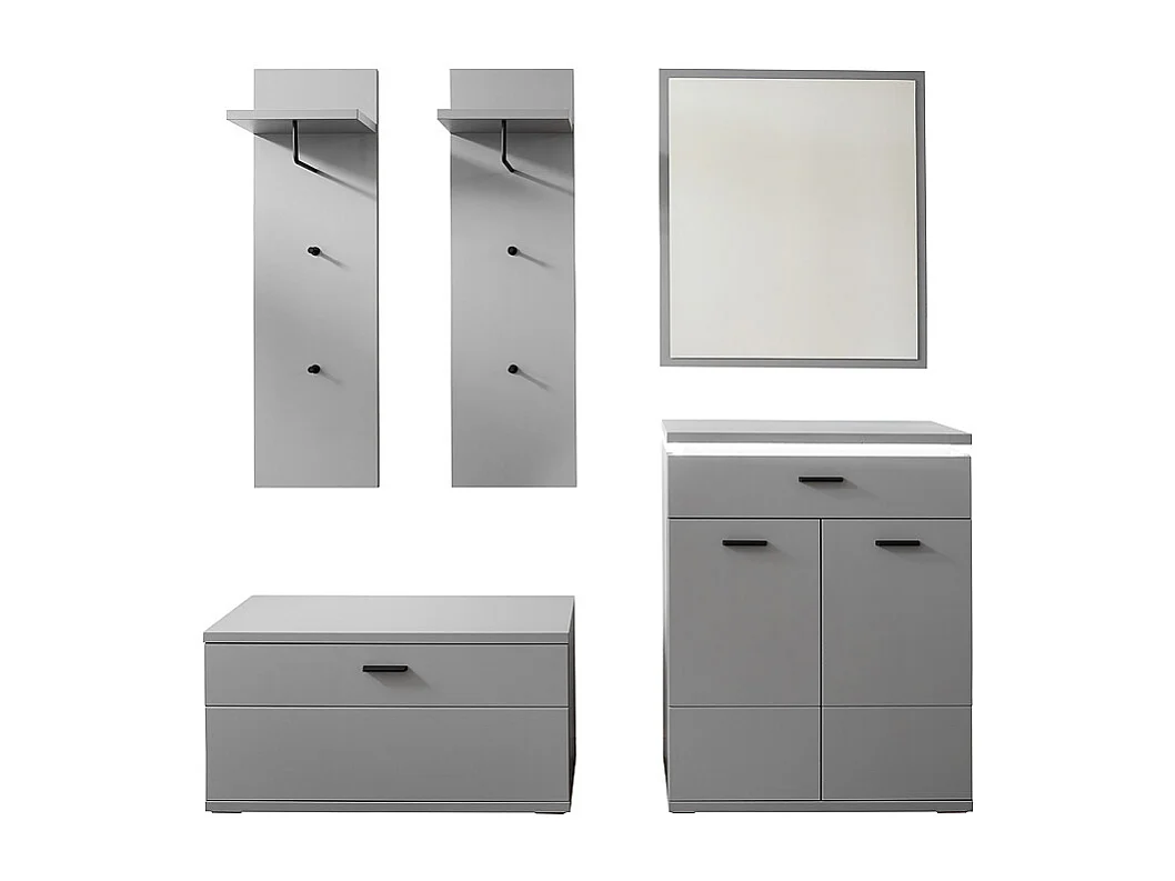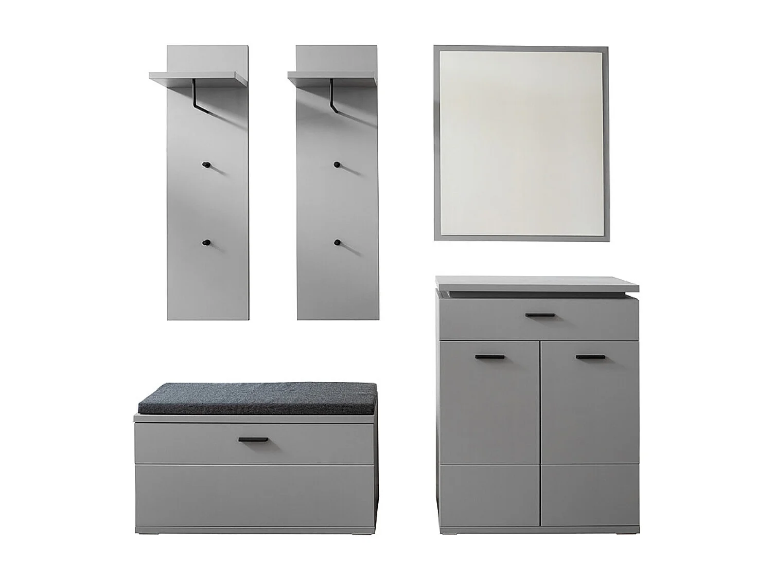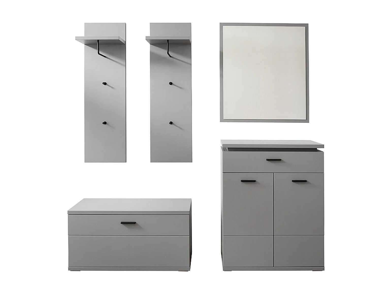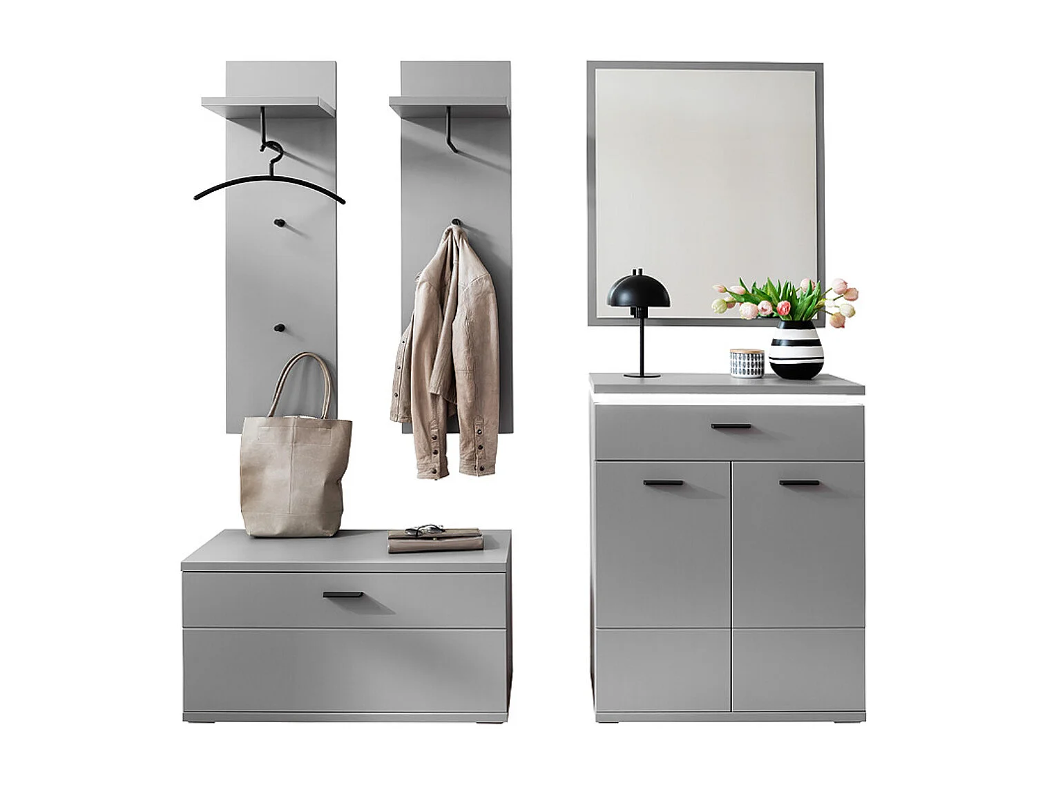 Ensemble d'entrée, armoire + banc de vestiaire + panneau d'armoire + commode + miroir coloris gris arctique