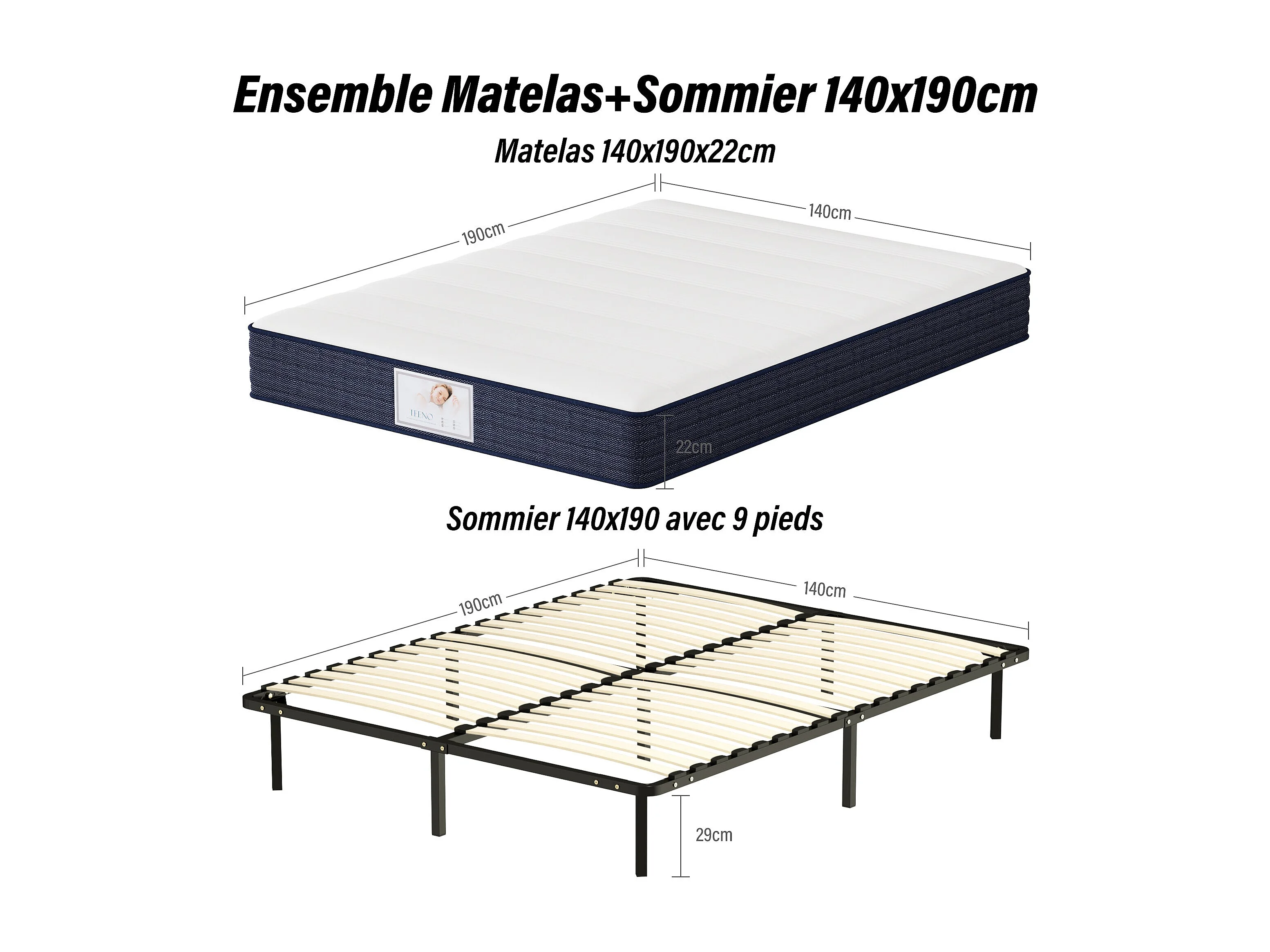 Ensemble Matelas à ressorts +Sommier à Lattes sur Pieds, 140x190cm, Epaisseur du Matelas 22cm