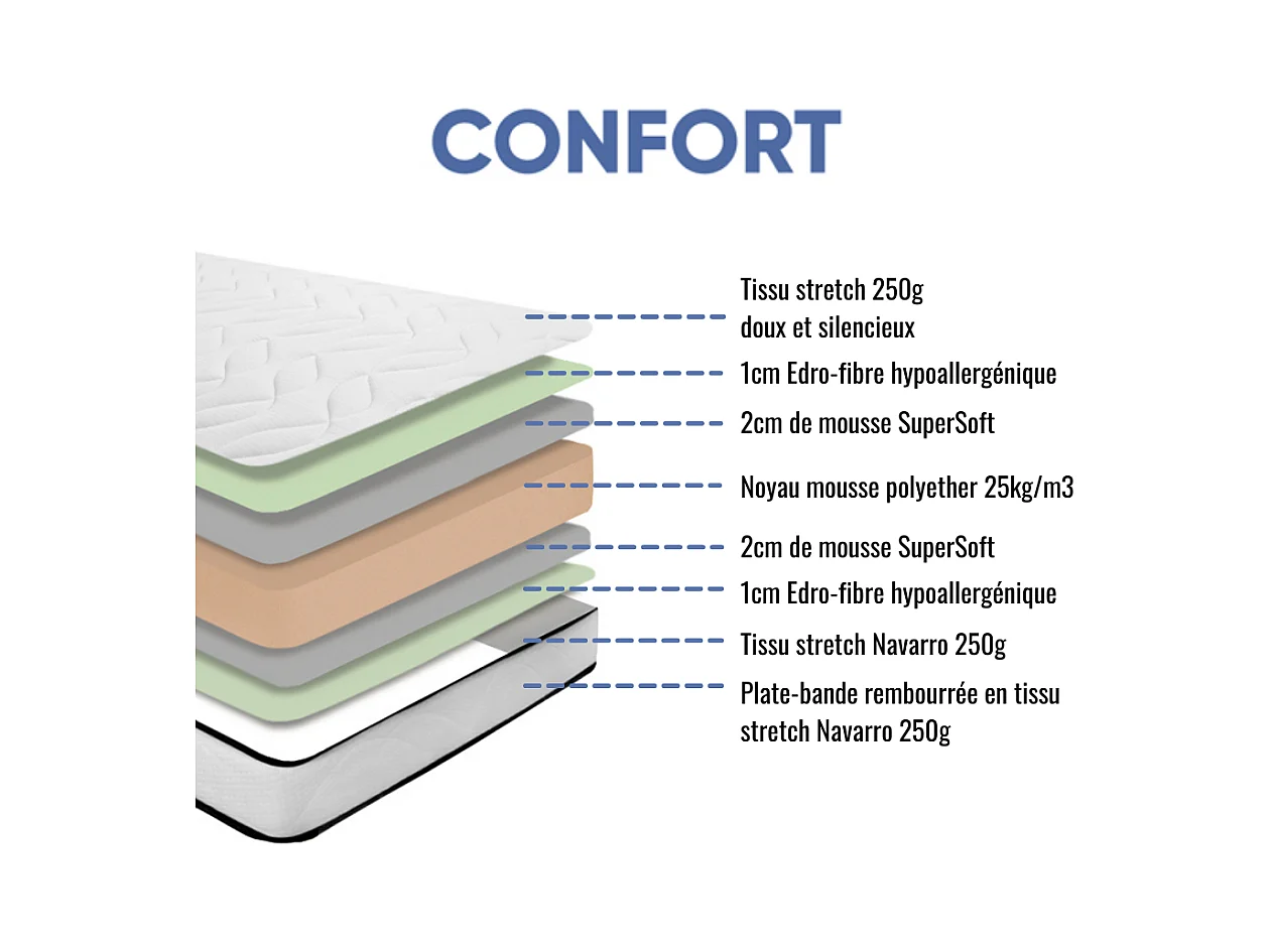 Ensemble Matelas mousse Confort 160x200 - 2 Oreillers mémoire 60x60 - Sommier kit Gris