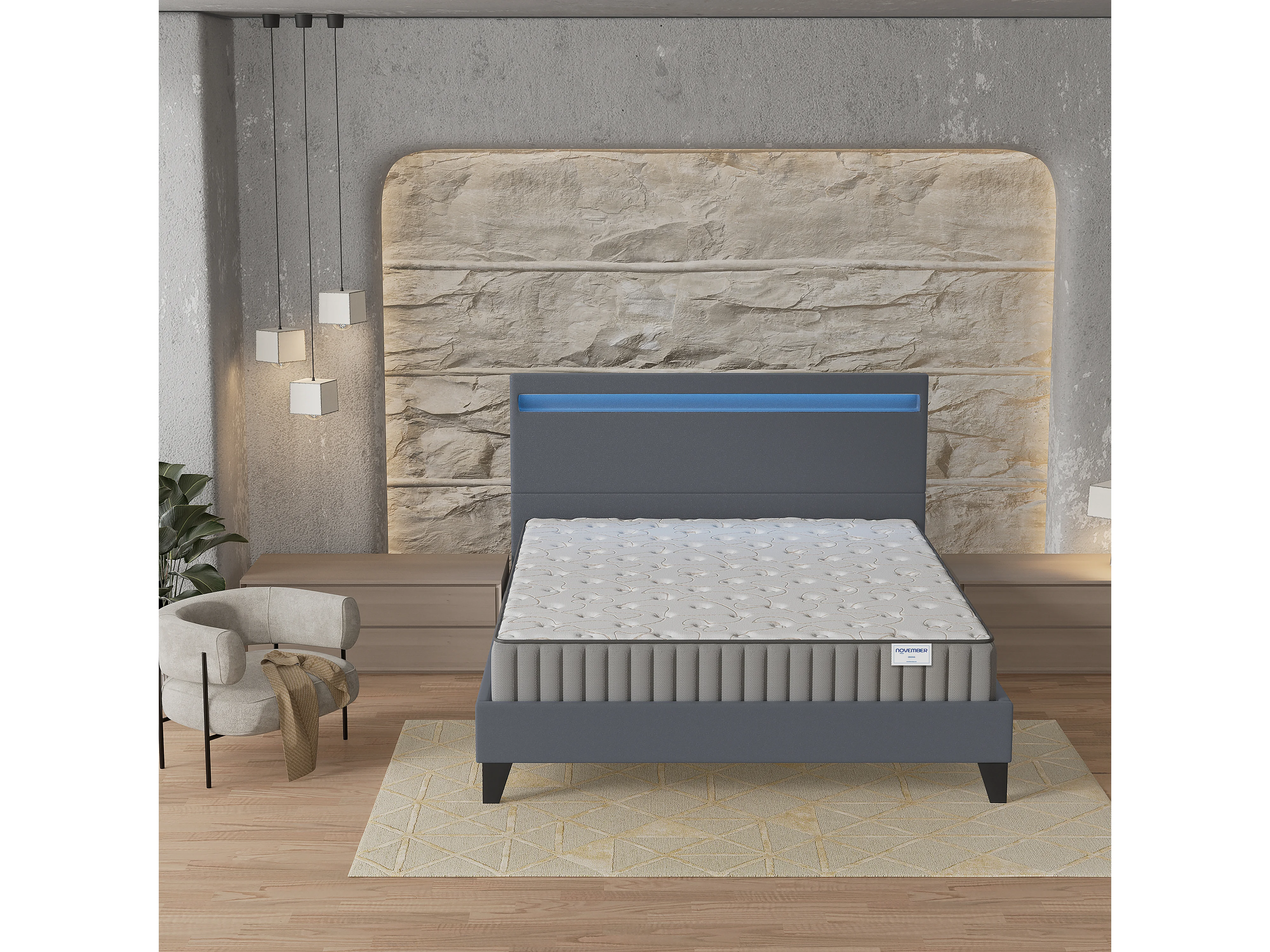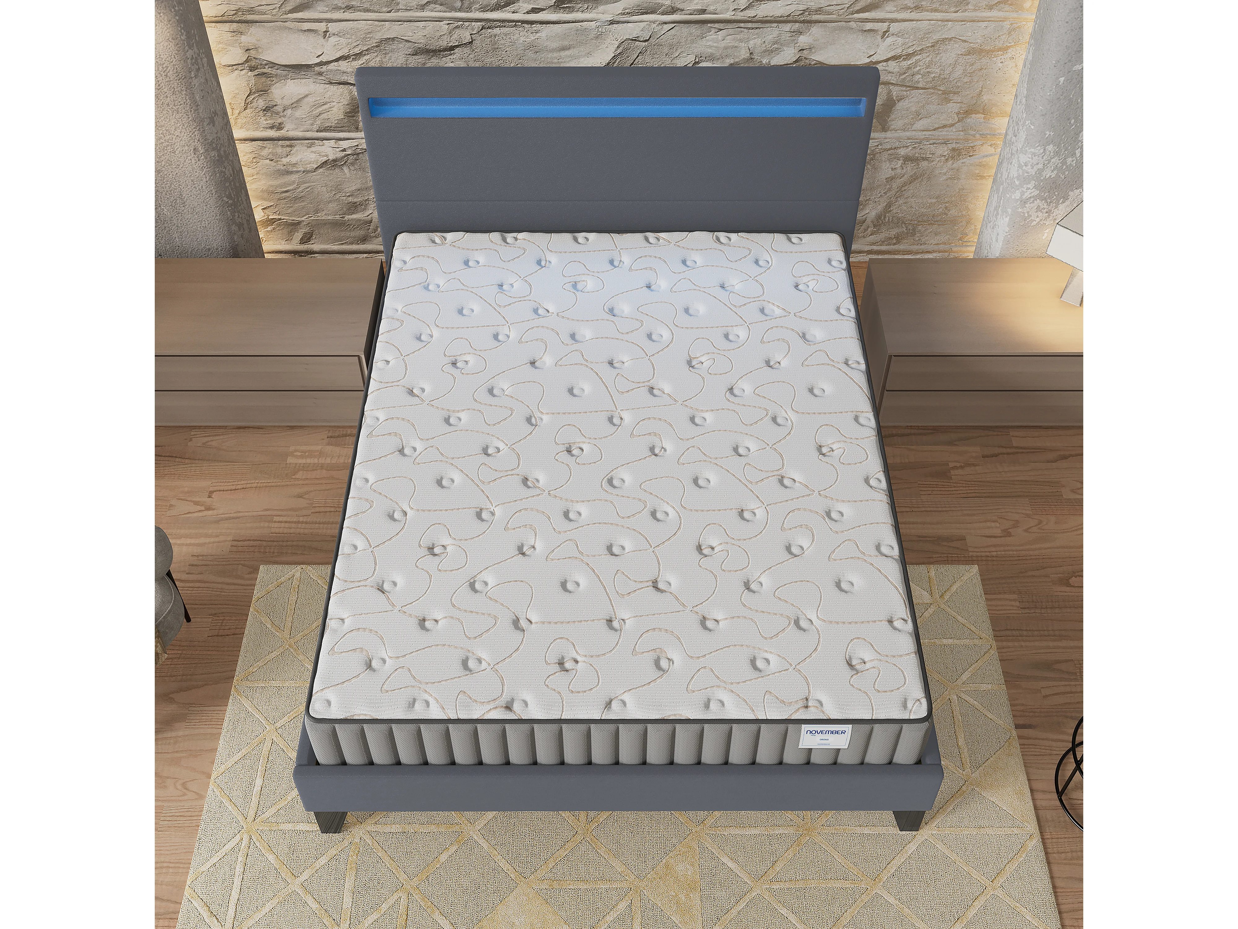 Ensemble Matelas + lit 120x190 cm, Matelas 22cm mousse, accueil mémoire de forme, lit à tête de lit LED similicuir gris