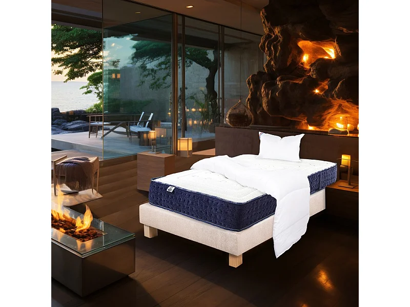 Ensemble Matelas Nuage (24cm), Sommier (20cm), Oreiller et Couette, mousses haute densité, mi-ferme, face été/hiver, 90x190cm