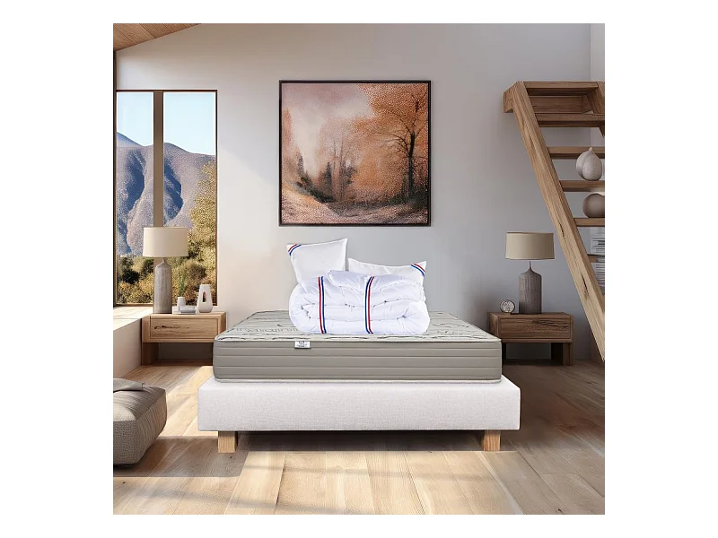 Ensemble Matelas Organic Cotton, 24 cm, mousses haute densité, ferme, face été/hiver + sommier beige ep20cm + oreiller + couette, 160x200cm