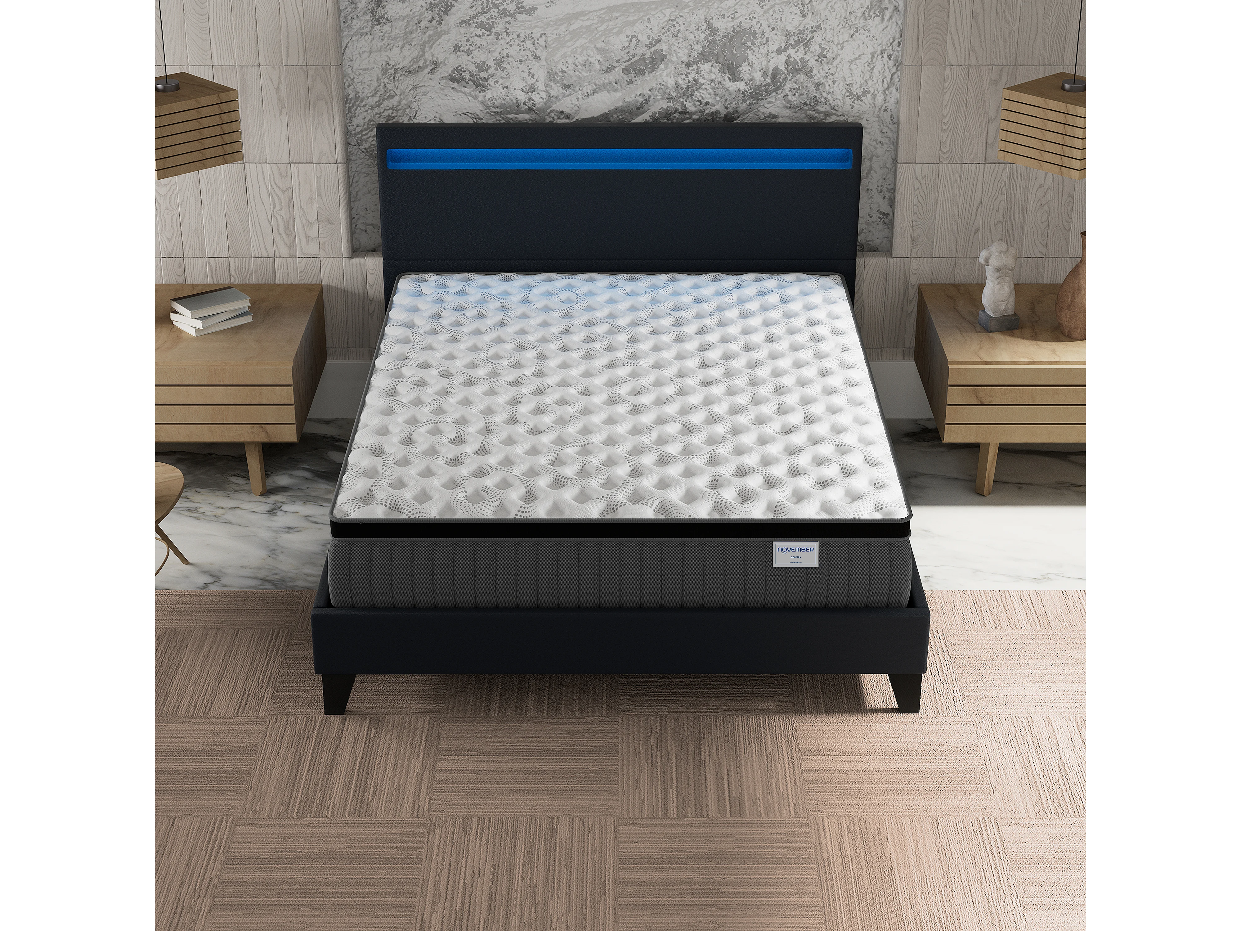 Ensemble Matelas + lit 120x190 cm, Matelas 30cm ressorts ensachés + mémoire de forme, lit à tête de lit LED similicuir noir