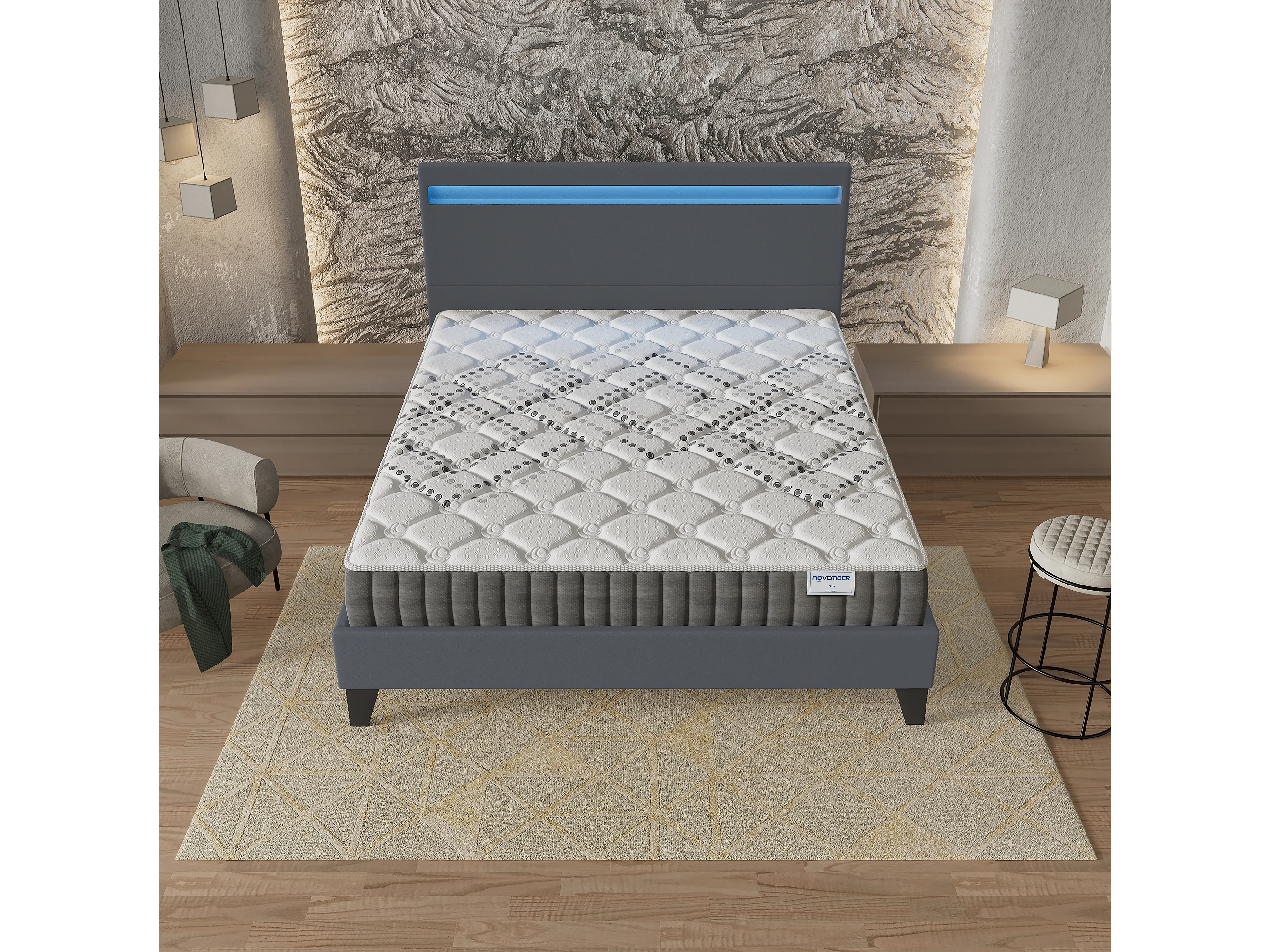 Ensemble Matelas + lit 140x190 cm, Matelas 20cm ressorts ensachés, accueil mousse, lit à tête de lit LED similicuir gris