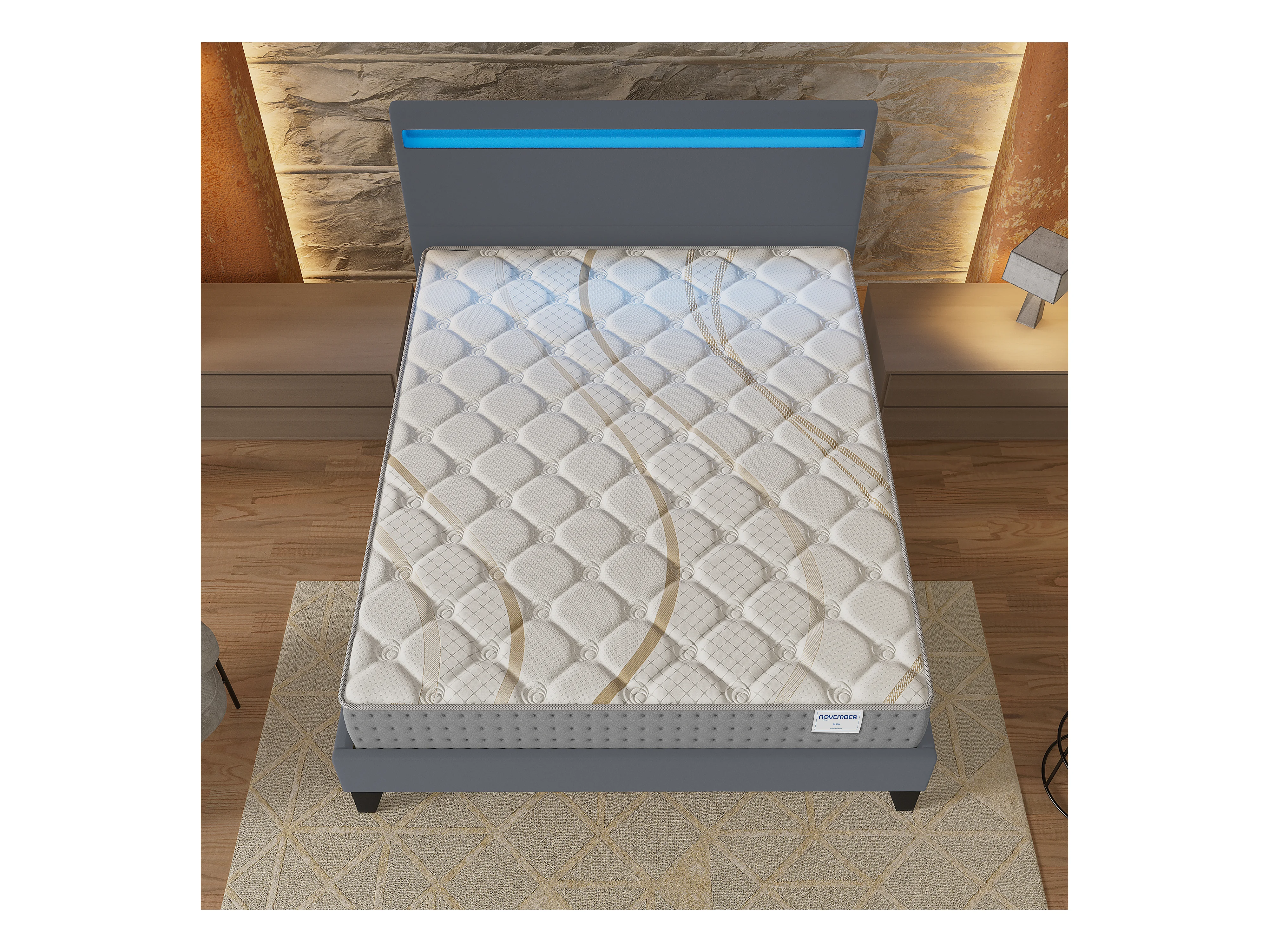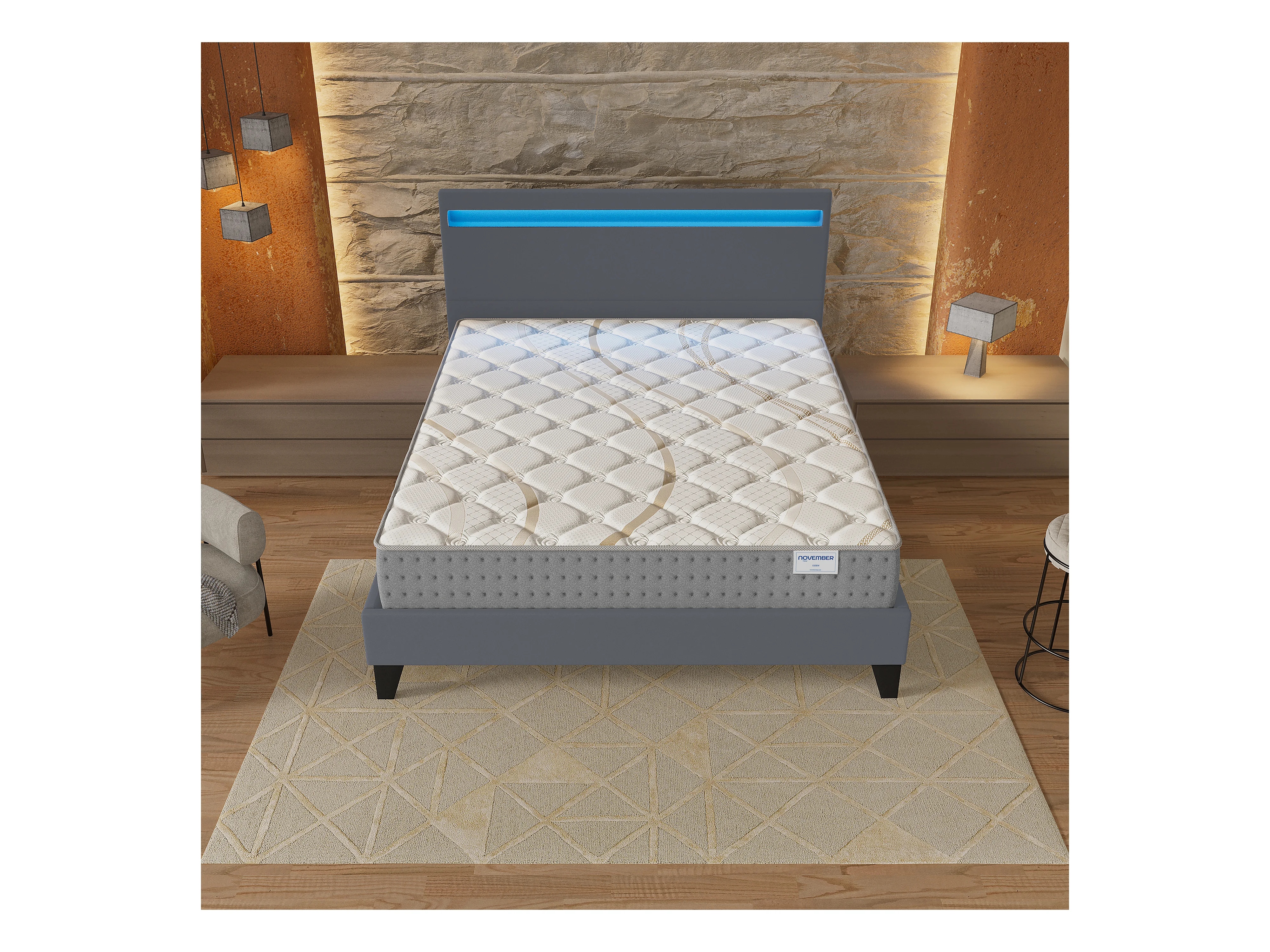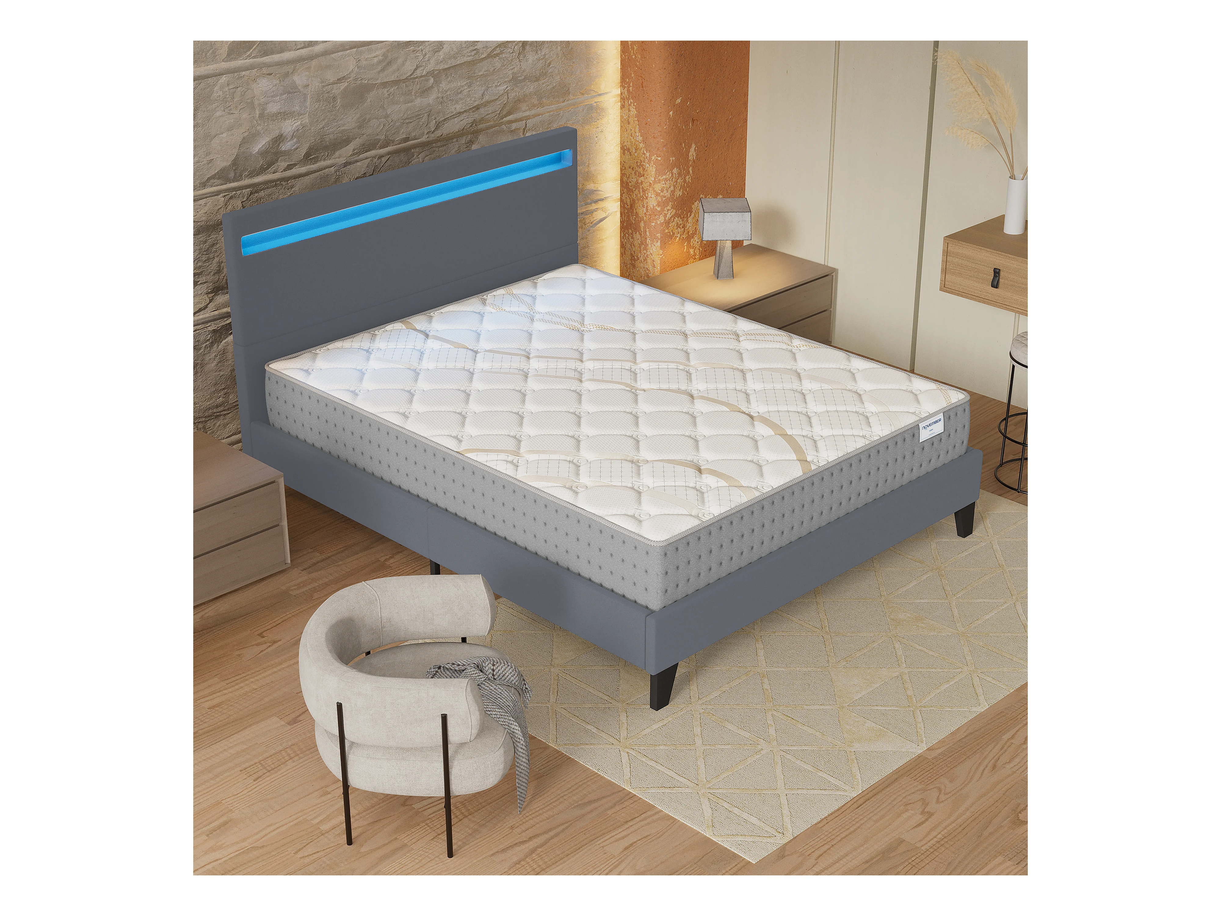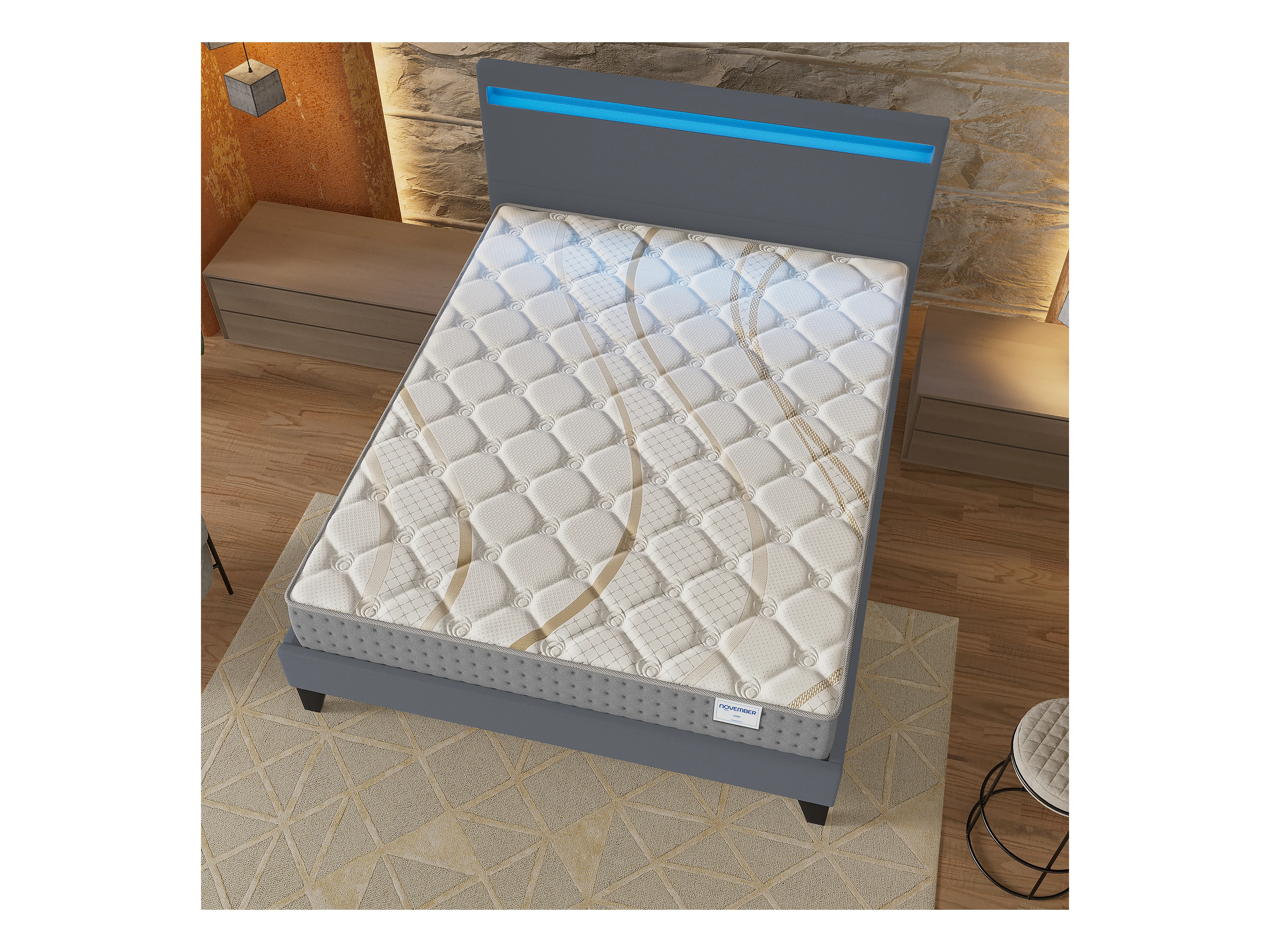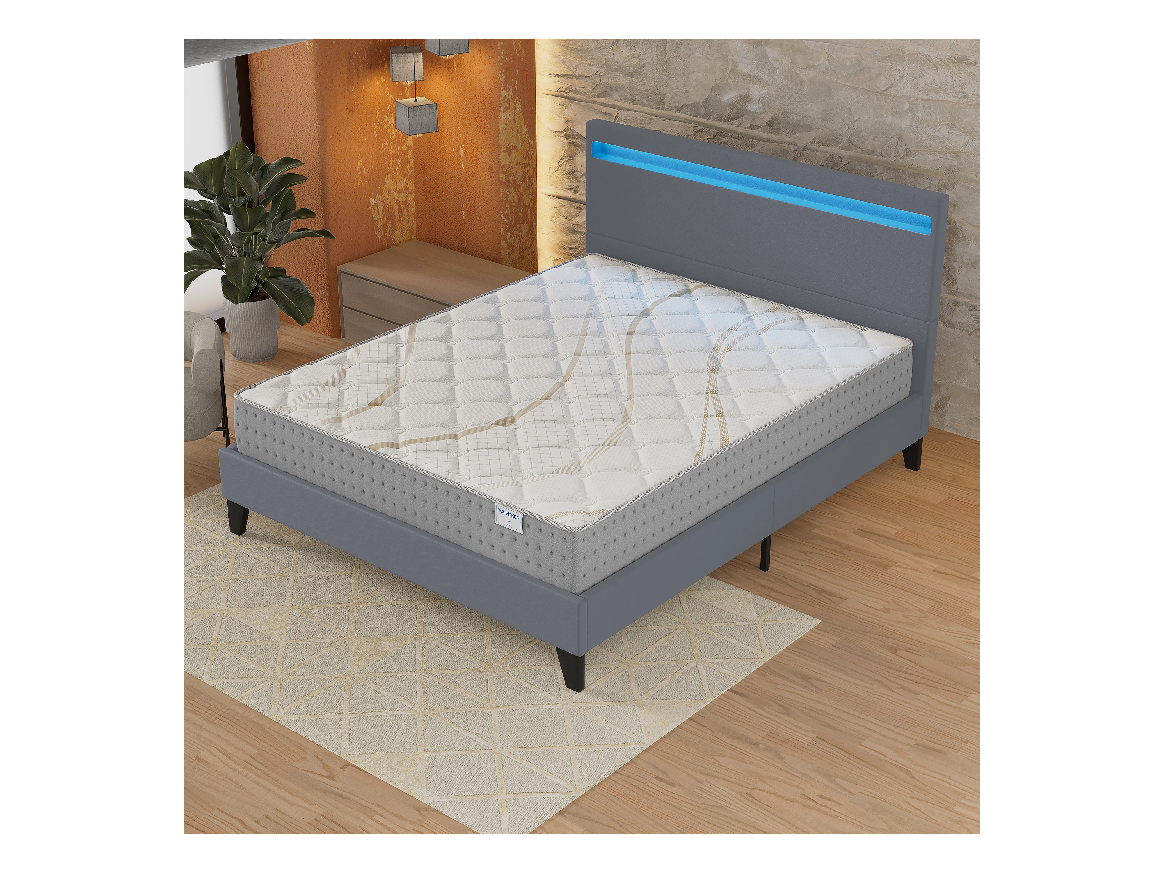 Ensemble Matelas + lit 140x190 cm, Matelas 25cm ressorts ensachés, accueil mousse, lit à tête de lit LED similicuir gris