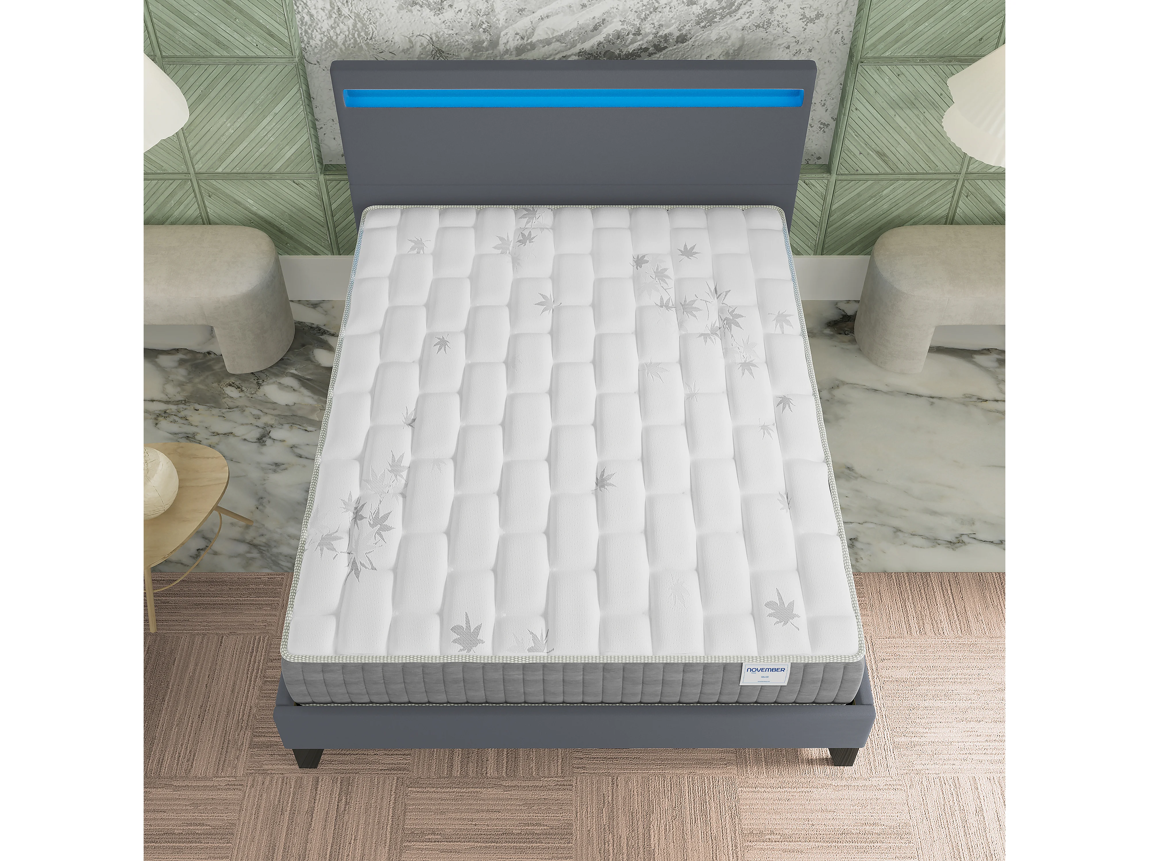 Ensemble Matelas + lit 140x200 cm, Matelas 25cm ressorts ensachés + mémoire de forme, lit à tête de lit LED similicuir gris