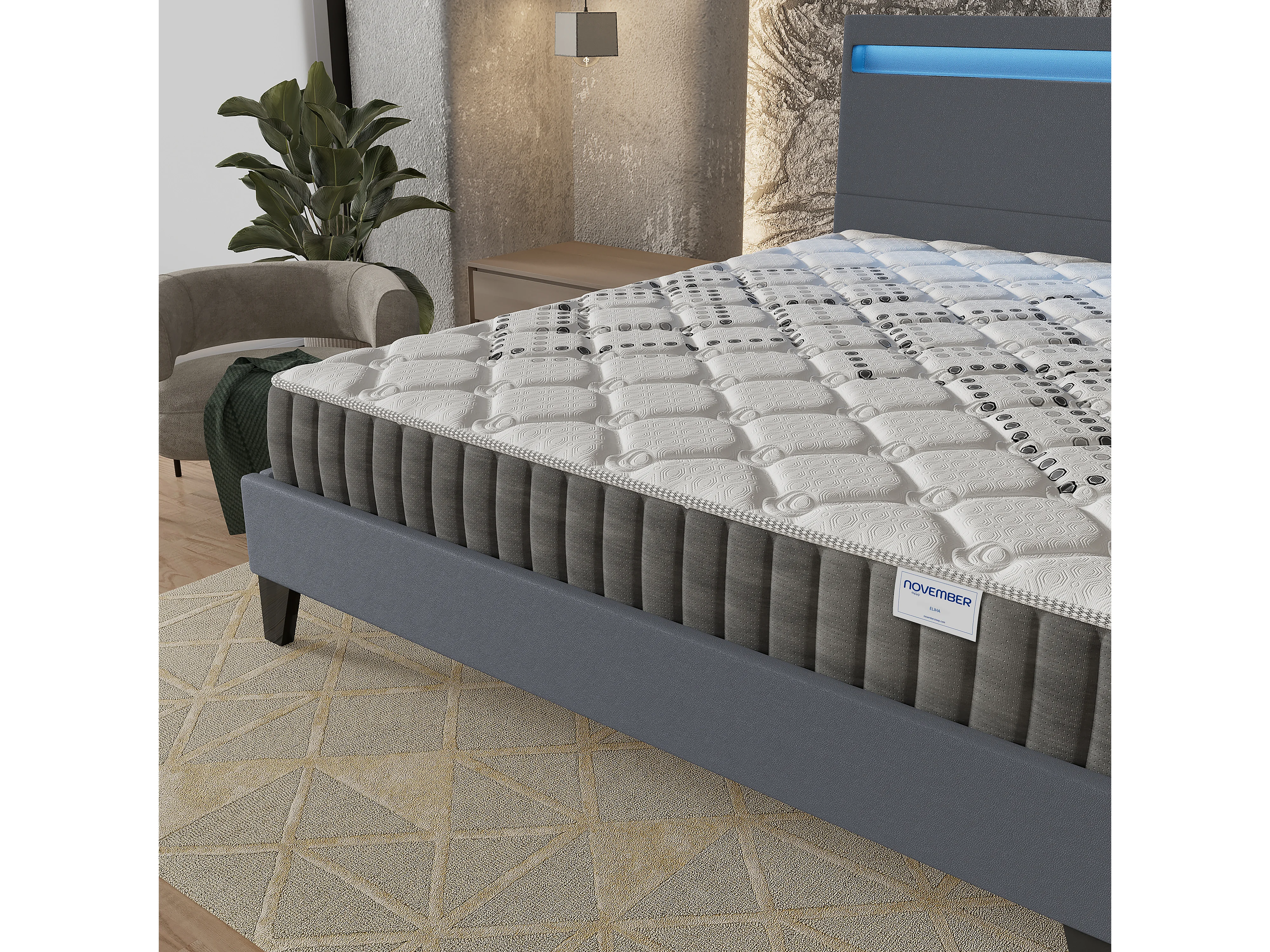 Ensemble Matelas + lit 160x200 cm, Matelas 20cm ressorts ensachés, accueil mousse, lit à tête de lit LED similicuir gris