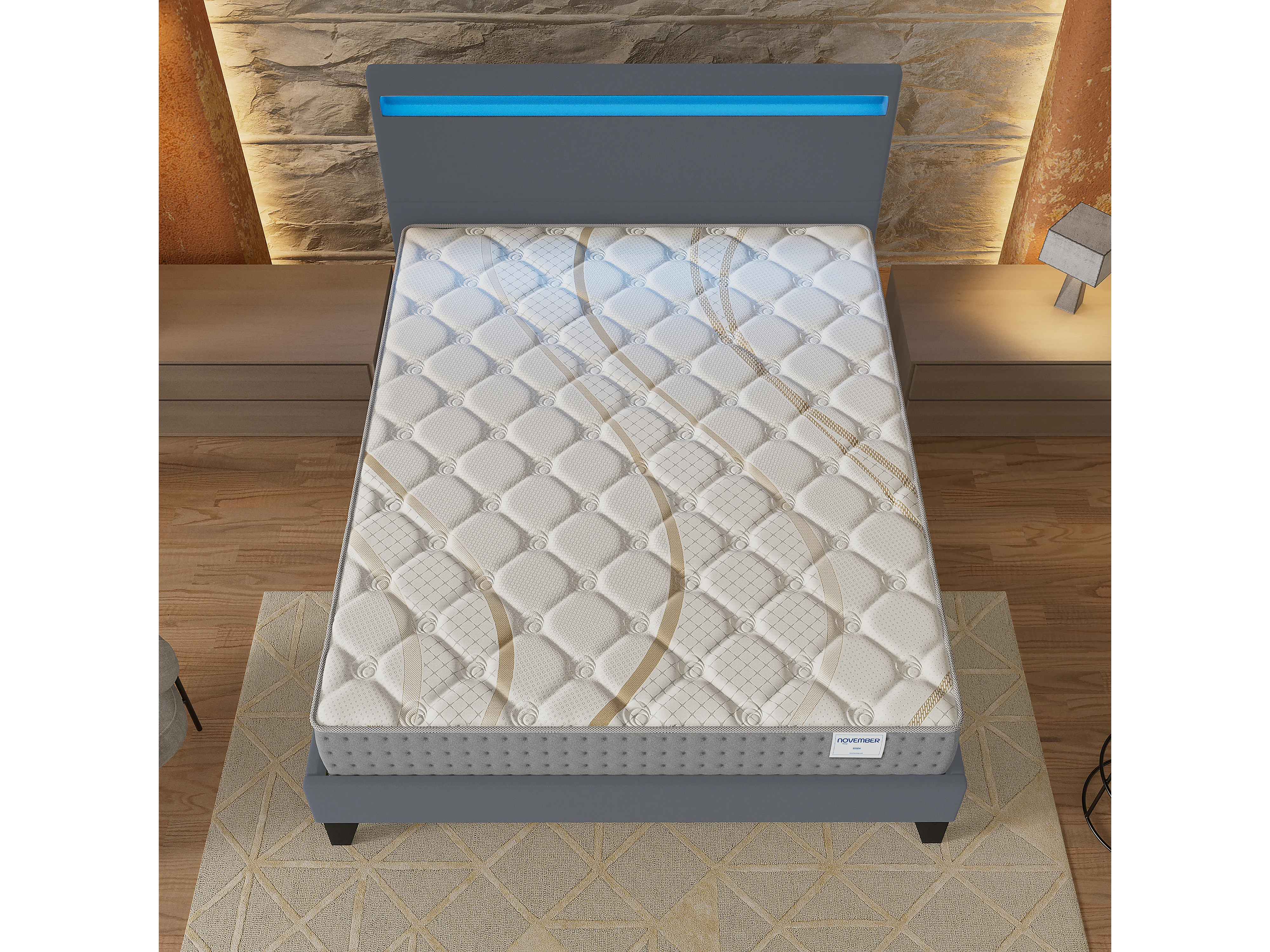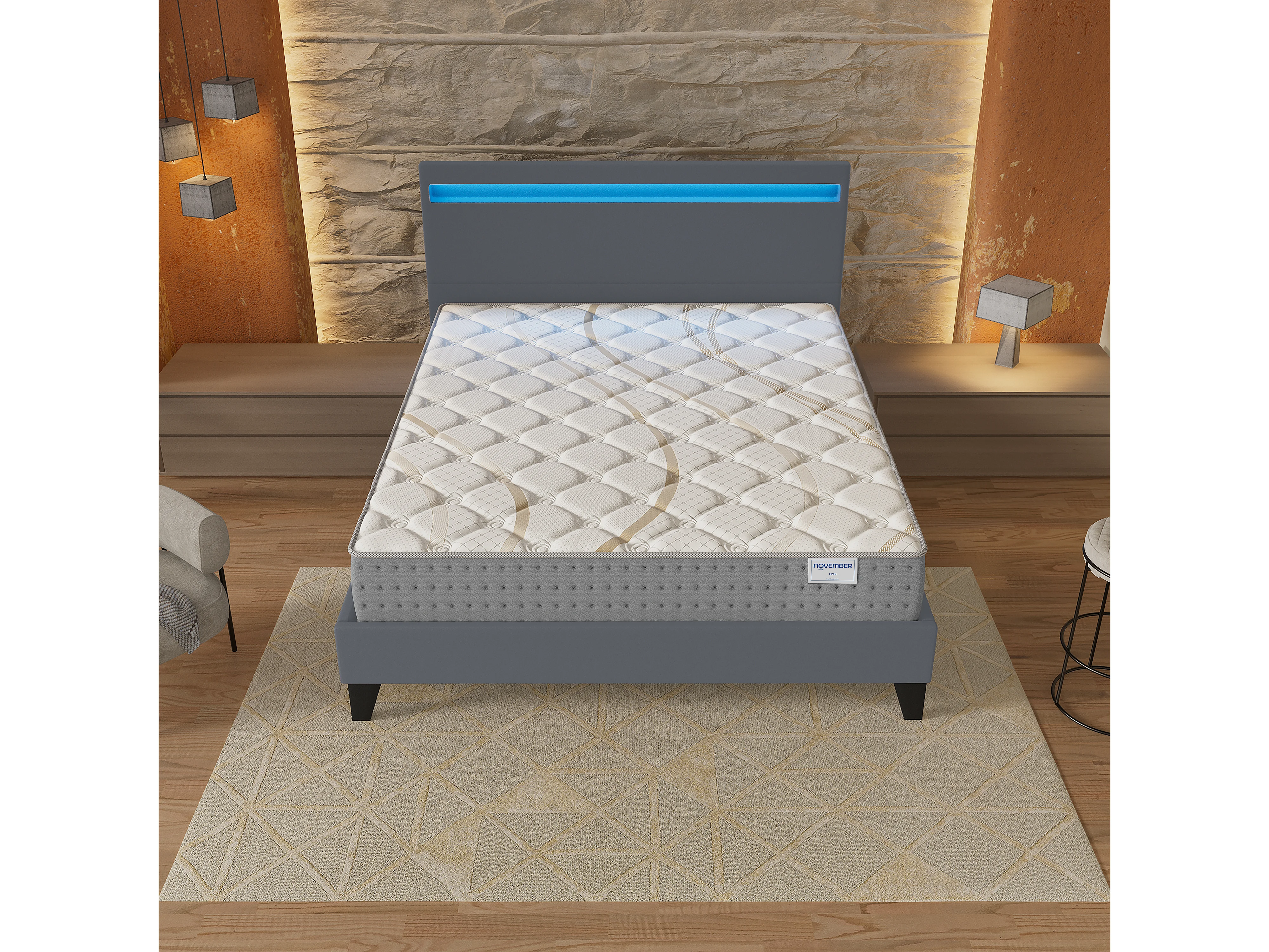 Ensemble Matelas + lit 160x200 cm, Matelas 25cm ressorts ensachés, accueil mousse, lit à tête de lit LED similicuir gris