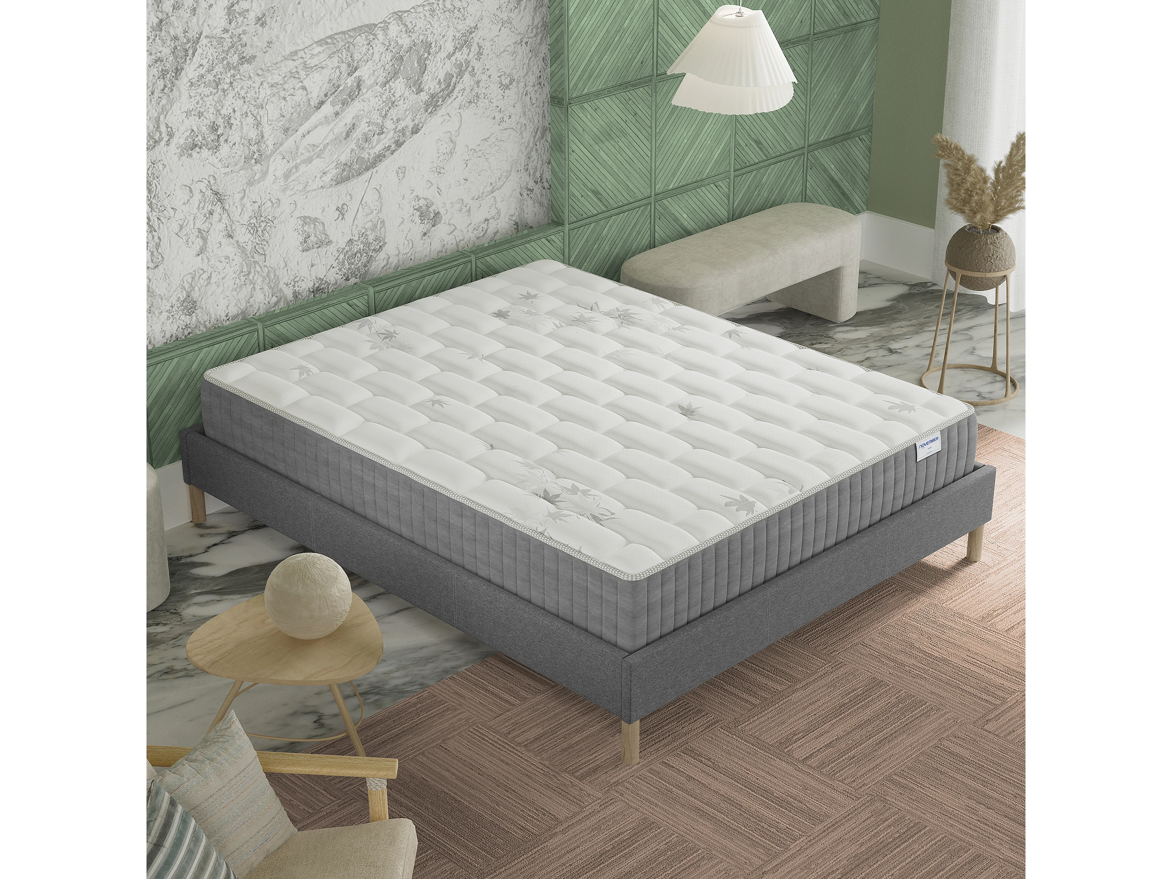 Ensemble Matelas + lit 120x190 cm, Matelas 25cm ressorts ensachés, accueil mémoire de forme, lit à lattes en bois, tissu gris