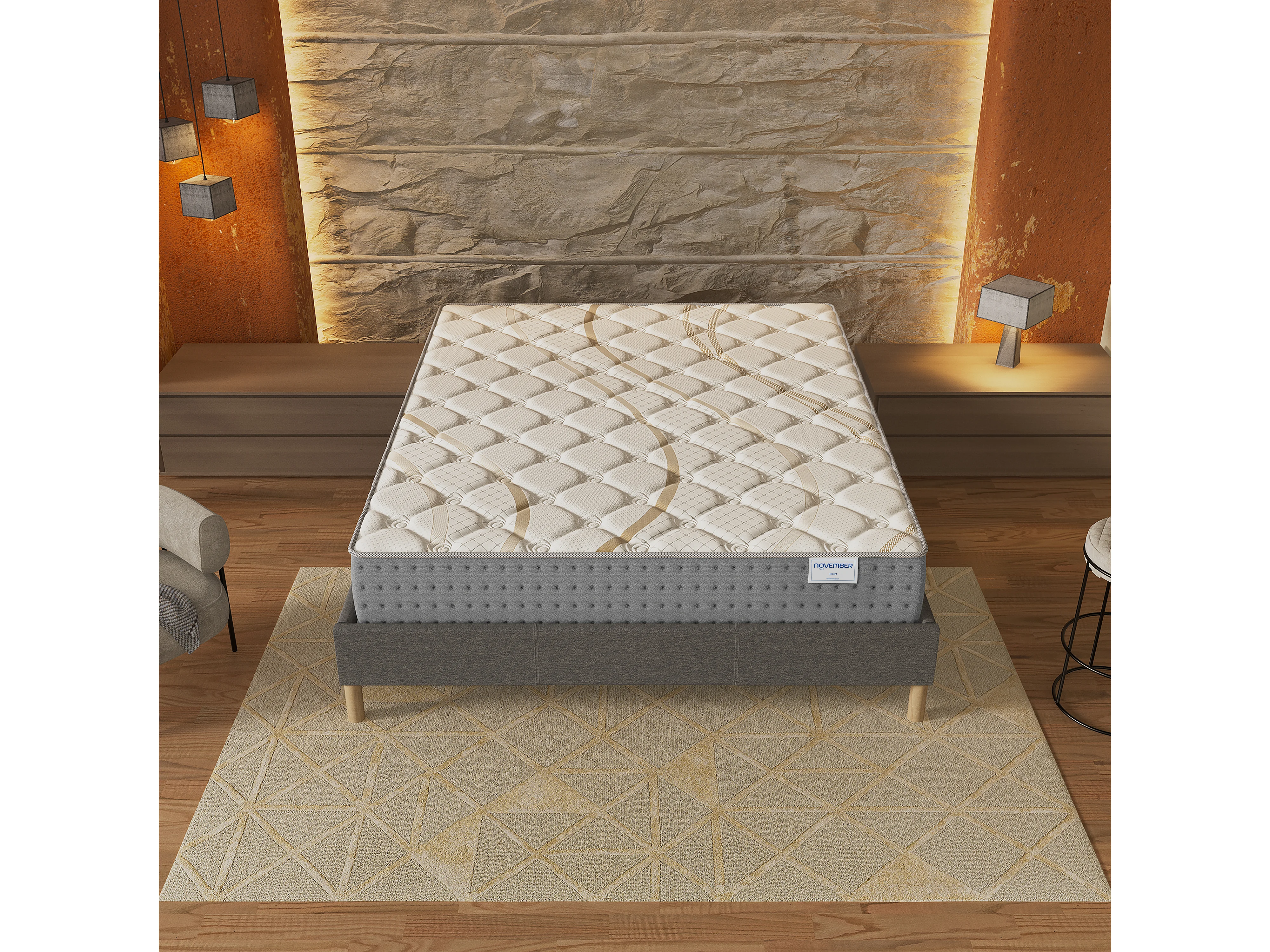 Ensemble Matelas + lit 180x200 cm, Matelas 25cm ressorts ensachés, accueil mousse, lit à lattes en bois, tissu gris