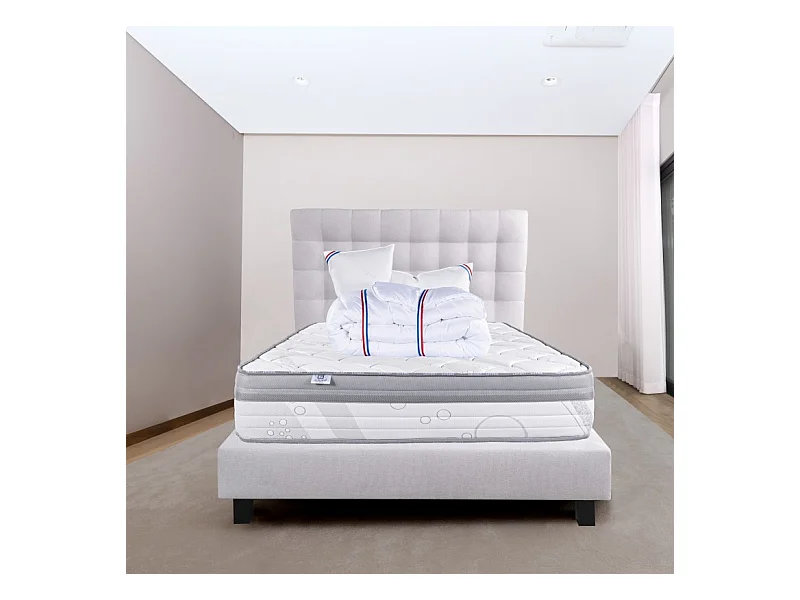 Ensemble Matelas ViscoPlus, 26 cm, mousses haute densité, ferme, face été/hiver+sommier gris ep20cm+oreiller+couette+Tête de Lit, 140x200cm