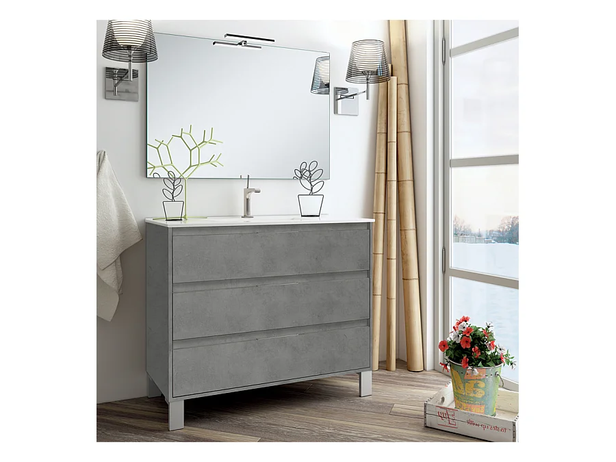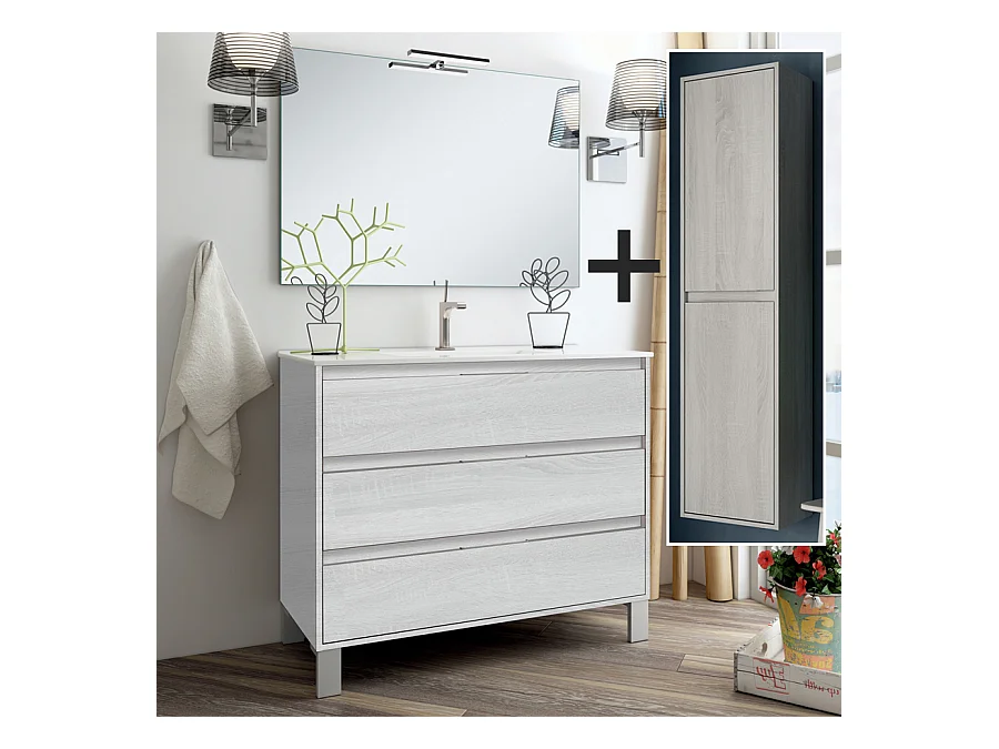 Ensemble meuble de salle de bain 100cm simple vasque + colonne de rangement TIRIS - hibernian (bois blanchi)