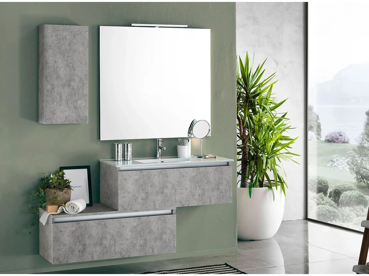 Ensemble meuble de salle de bain 2 tiroirs 1 armoire effet béton mat et miroir à LED Teph L 150cm