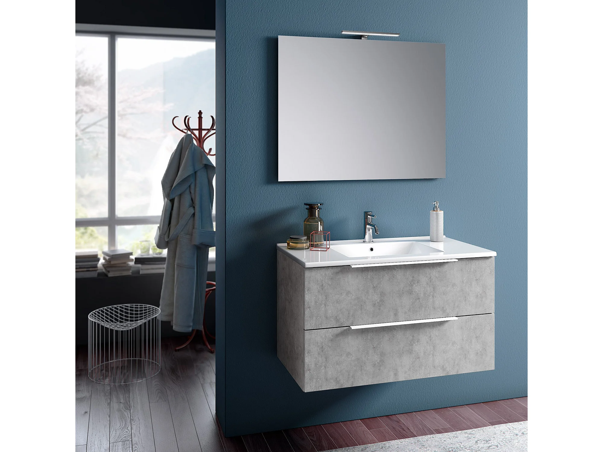 Ensemble meuble de salle de bain 2 tiroirs effet béton et miroir à LED Mola L 90cm